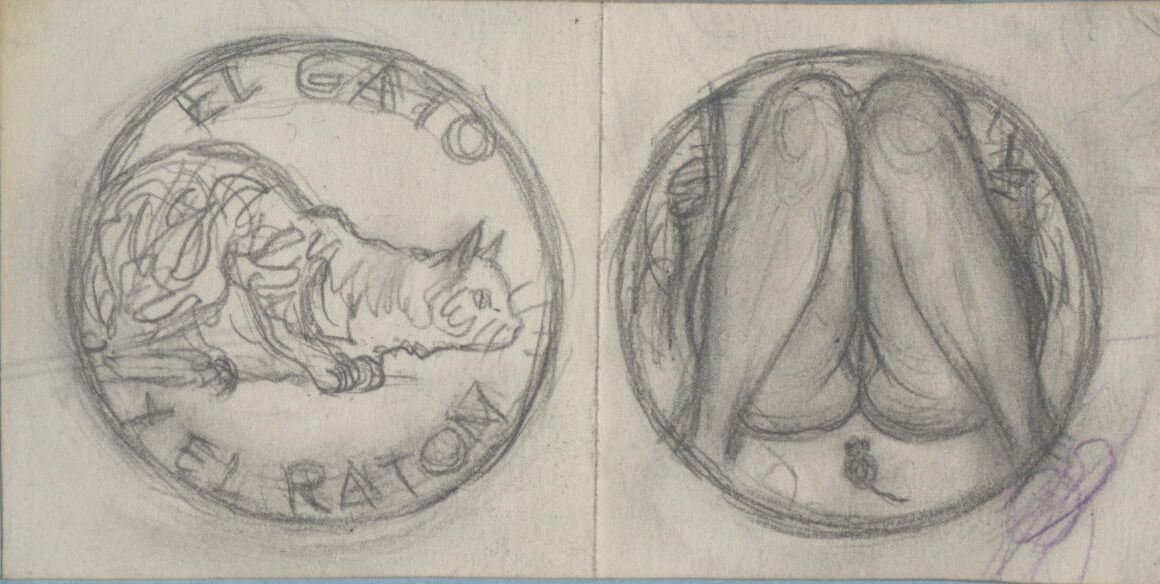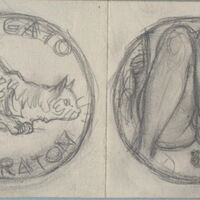 - Boceto a lápiz de una medalla titulada el gato y el ratón, en cuyo anverso se aprecia la figura de un gato atento a algo, junto al reverso donde se aprecia a un ratón cercano a las piernas de una mujer desnuda, tumbada mientras lee un libro que sujeta en sus manos y apoya en sus muslos.Futura medalla, boceto sobre alguna serie. Sin referencias.