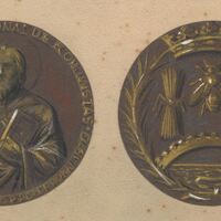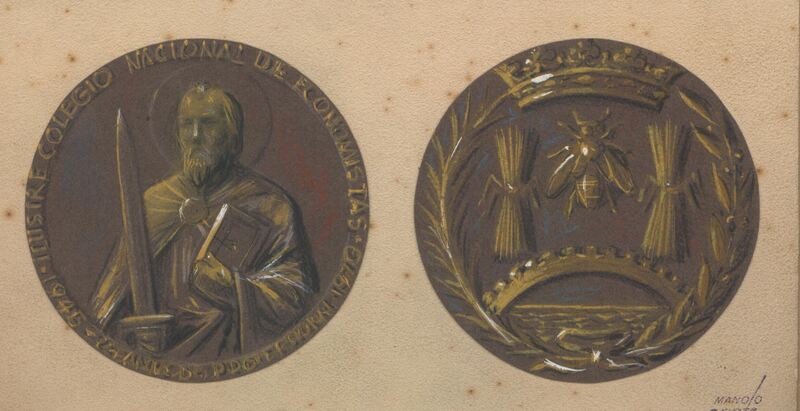 Medalla del Ilustre Colegio Nacional de Economistas en cuyo anverso se aprecia la figura de un santo sujetando una espada y un libro y en su reverso una corona de espigas y trigo con la imagen central de una abeja reina.boceto para el Ilustre colegio nacional de economistas. Otros archivos: MBR/1502