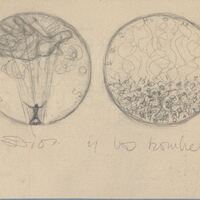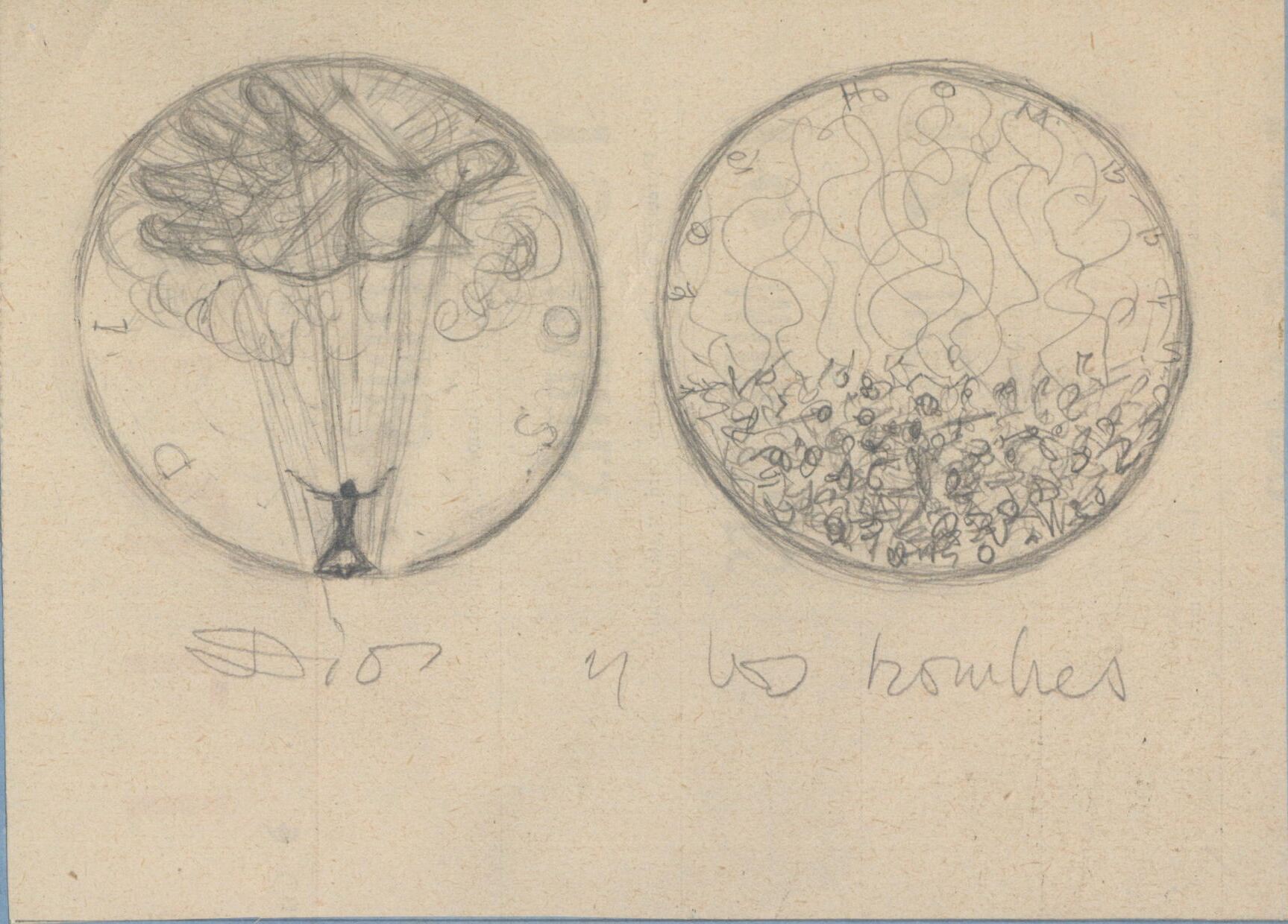 - Boceto a lápiz de la medalla titulada Dios y los Hombres, en cuyo anverso se aprecia una mano que sale de una nube (Dios) sujetando los hilos de un títere que es un hombre, a su lado el reverso con una multitud de hombres luchando entre sí.Sin referencias, bocetode estudio de una futura medalla.