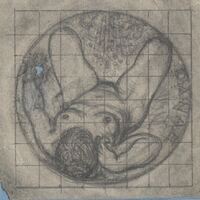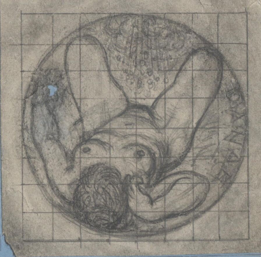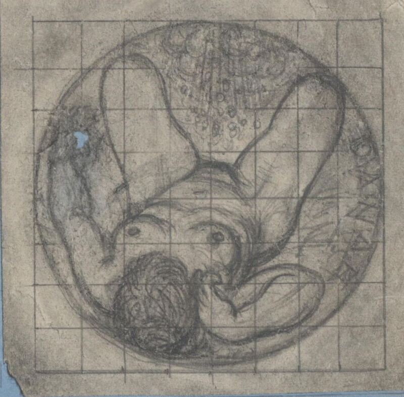 - Primer boceto a lápiz de trazos rápidos sobre fondo cuadriculado de una de las caras de una medalla, con la imagen de una mujer desnuda tumbada y con las piernas abiertas, presuponemos que recibiendo a Zeus.Boceto para una futura medalla de la Serie erótica. Sin referencias