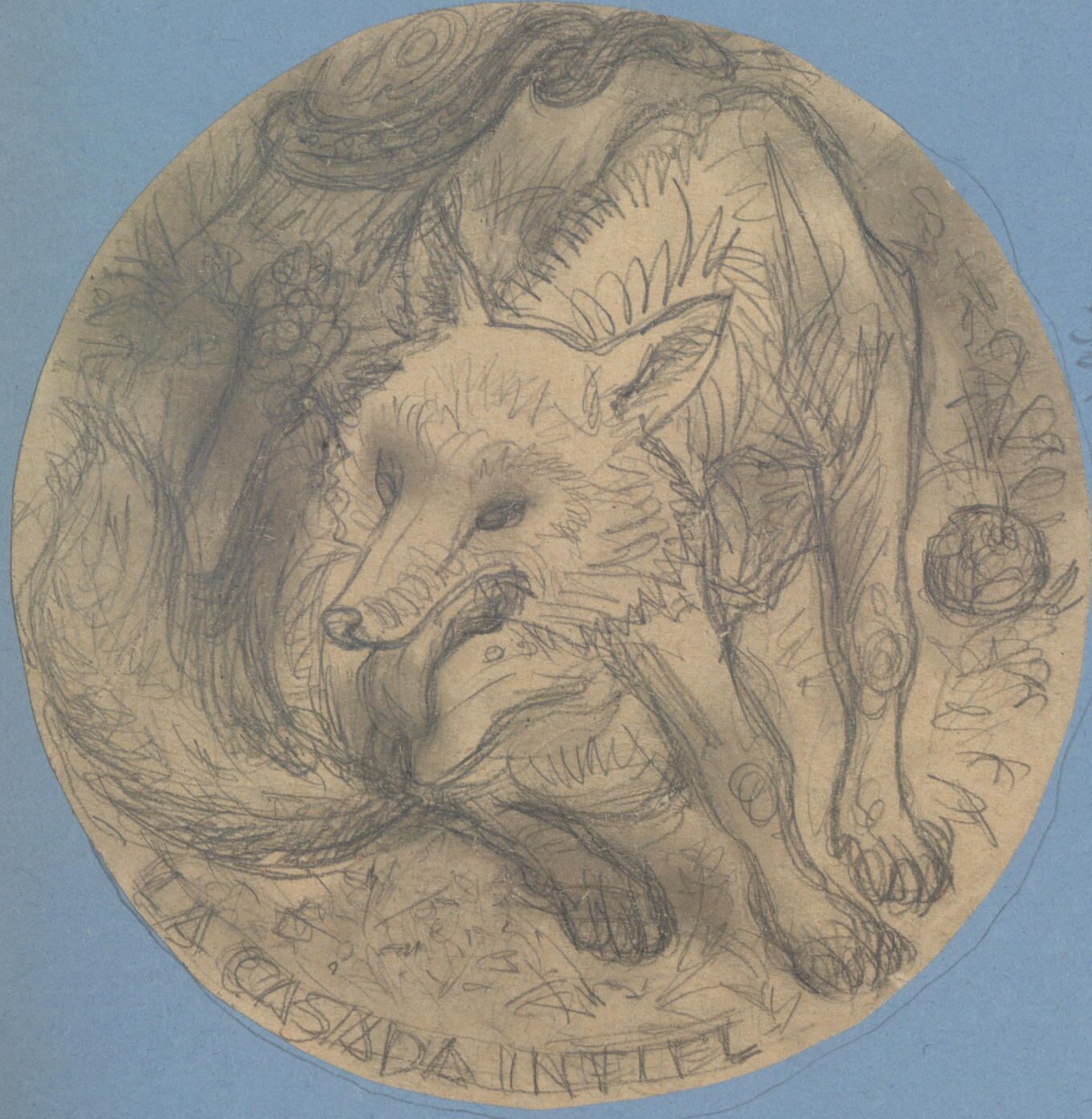 - Boceto a lápiz de una de las caras de una medalla titulada La casada infiel, representada por la imagen de un lobo o un zorro en primer término. El movimiento circular de la medalla se complementa muy bien con el del animal.boceto para laserie erotica realizada de Manolo Prieto.