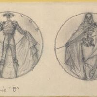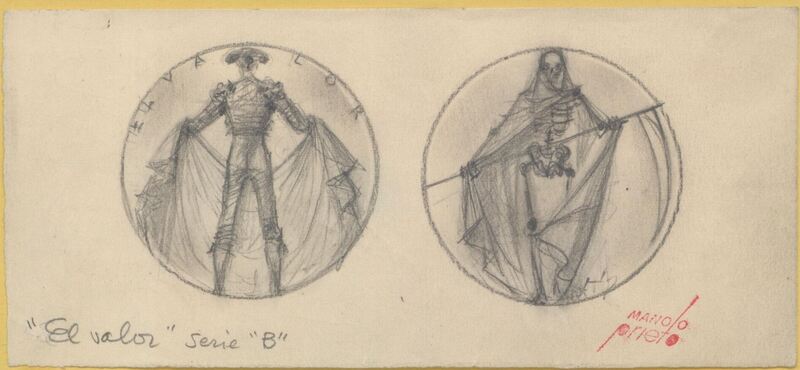 Boceto a lápiz de las caras de una medalla titulada El Valor, representado con la figura de un torero de espaldas sujetando el capote junto al reverso donde se aprecia a una calavera portando una guadaña, dos imágenes que detallan el valor del torero en cada faena donde se enfrenta no sólo al animal sino a la posibilidad de la muerte.Para la serie B tauromaquia de la Casa de la Moneda, no realizada. Sin mas referencias.