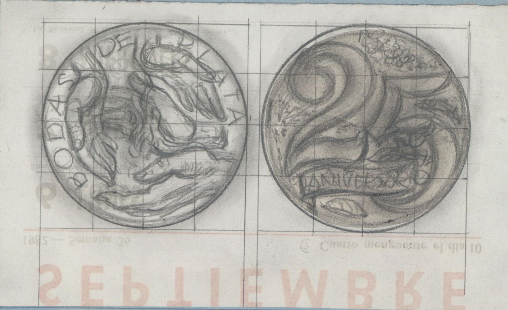 Primer boceto de la medalla conmemorativa de unas bodas de plata, representada por la imagen de unas manos rodeando una llama para que no se apague junto al reverso donde se aprecian los números en grande ocupando casi todo el espacio del campo junto a una cartela donde se lee aniversario.Boceto del anverso y reverso sobre la medalla de lasBodas de Plata, para Numismática Iberica. Medalla reproducida en plata en poder de Manuel Prieto Rodriguez.