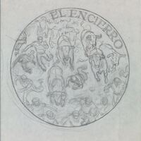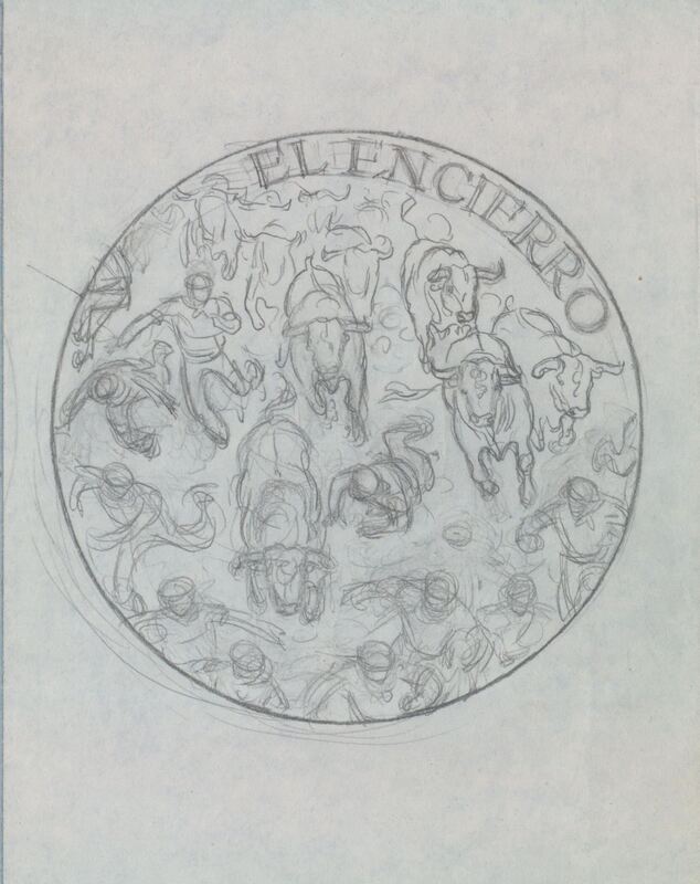 - Boceto a lápiz de una de las caras de una medalla titulada El Encierro, donde se representa a una manada de toros sueltos, corriendo tras los hombres que participan en el encierro, típico de las fiestas locales y populares.estudio sobre el tema del encierro. No savemos si este era para Bilbao o para la Casa de la Moneda-