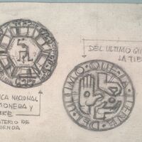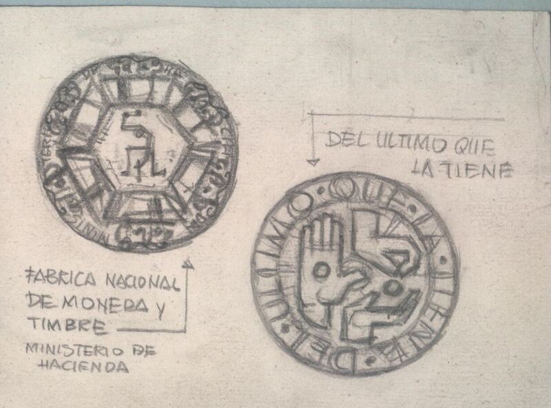 - Boceto a lápiz de las caras de la medalla conmemorativa de la Fábrica Nacional de moneda y timbre, representada por un hombre que cincela el metal junto a unas manos que con la palma abierta esperan al reparto de monedas.Estudio realizado paraLa casa dela Moneda, no llegó a realizarse.