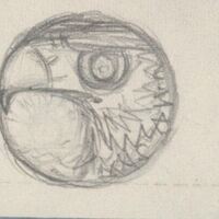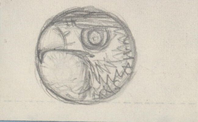 - Primer boceto, de trazos sueltos y rápidos, de una medalla, donde es difícil de apreciar la escena representada. Es la cabeza de un Aguila que ocupa las dos terceras parte de la medalla.Primeros esvozos para una futura medalla, apreciandose ya en ella la cabeza de un aguila. Sin referencias.