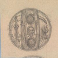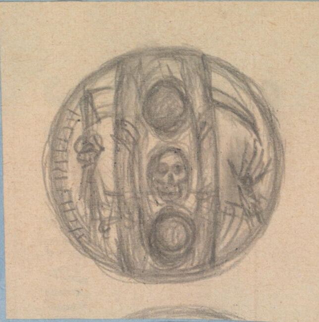 - Primer boceto a lápiz de una medalla, donde se aprecia difícilmente la silueta de la cara de una calavera que levanta las manos frente a dos hombres que la rodean, y que tiene en la mano una guadaña.Primeros trazos sobre una idea para una futura medalla. Sin referencias.