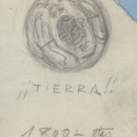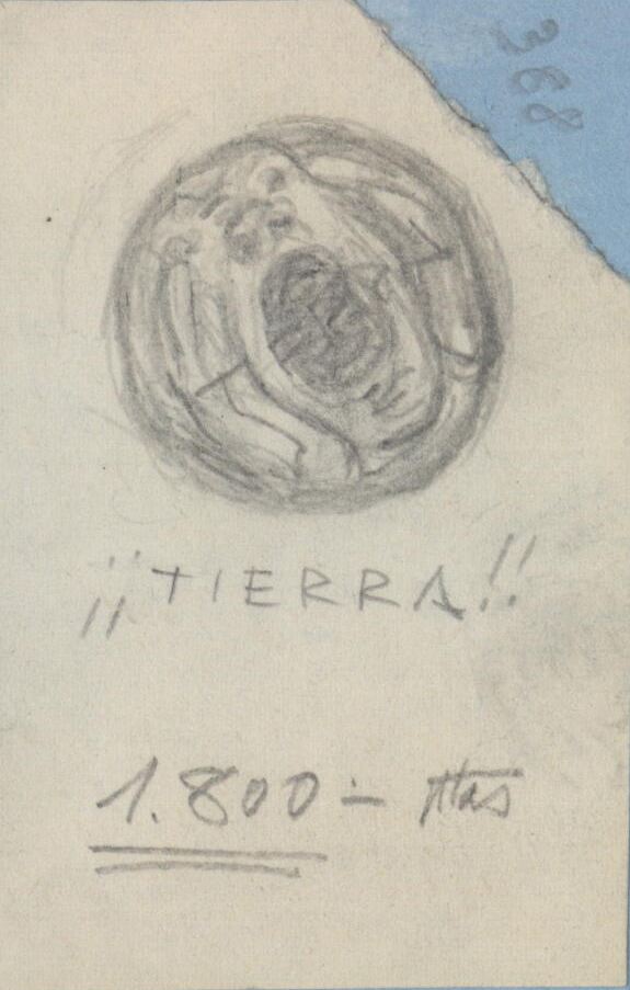 - Primer boceto de una medalla titulada Tierra, donde ocupando todo el espacio se aprecia una gran boca abierta de la cara de una persona que grita tierra, debajo la anotación a lápiz del autor “1.800 pts”.primeros trazos sobre una futura medalla probablemente se tratase sobre el descubrimiento de América.