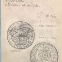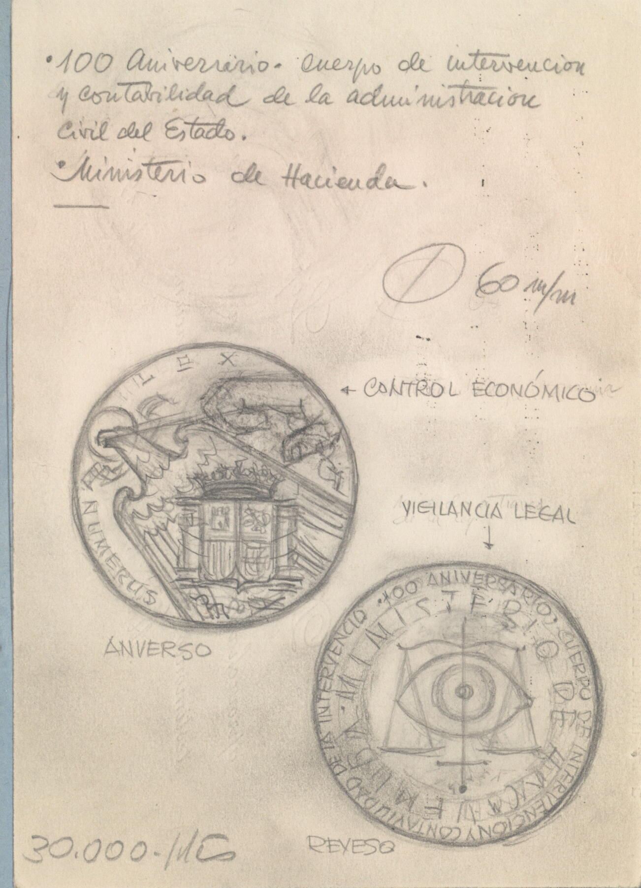 Boceto a lápiz de las caras de una medalla conmemorativa del centenario del Ministerio de Hacienda, en el anverso el dibujo de un escudo con el águila imperial representando el control económico junto al reverso donde se aprecia una balanza con un gran ojo en medio símbolo de la vigilancia legal del Estado.Estudio para una futura medalla, anverso y reverso. Sin referencias.