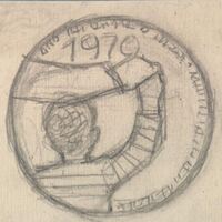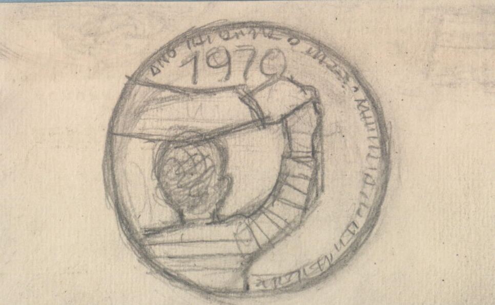 - Boceto a lápiz de una de las caras de una medalla donde se lee año 1970, junto a la figura de un niño de espaldas con jersey a rayas, que coge la mano de su padre, que presuponemos que lo está guiando.Estudio para una posible medalla. Sin Referencias.