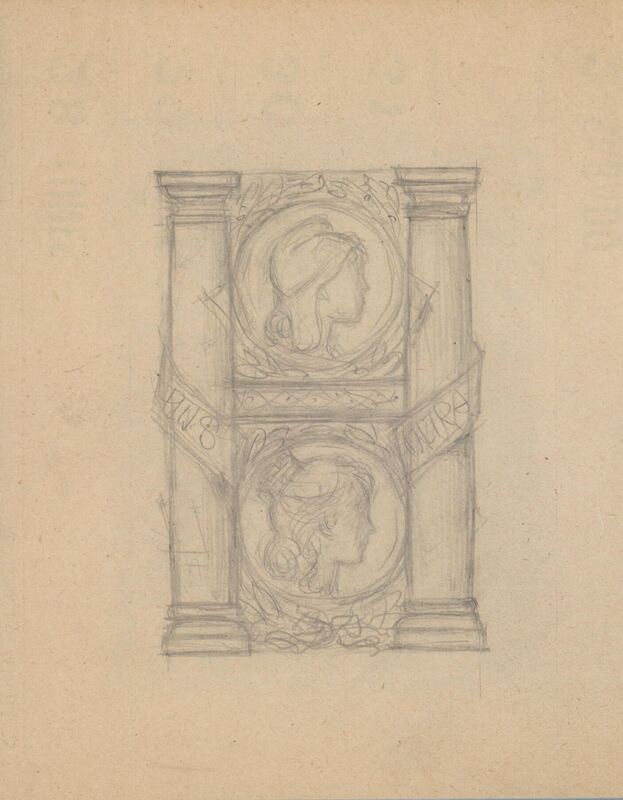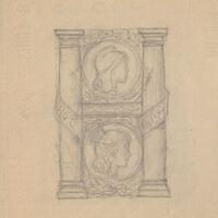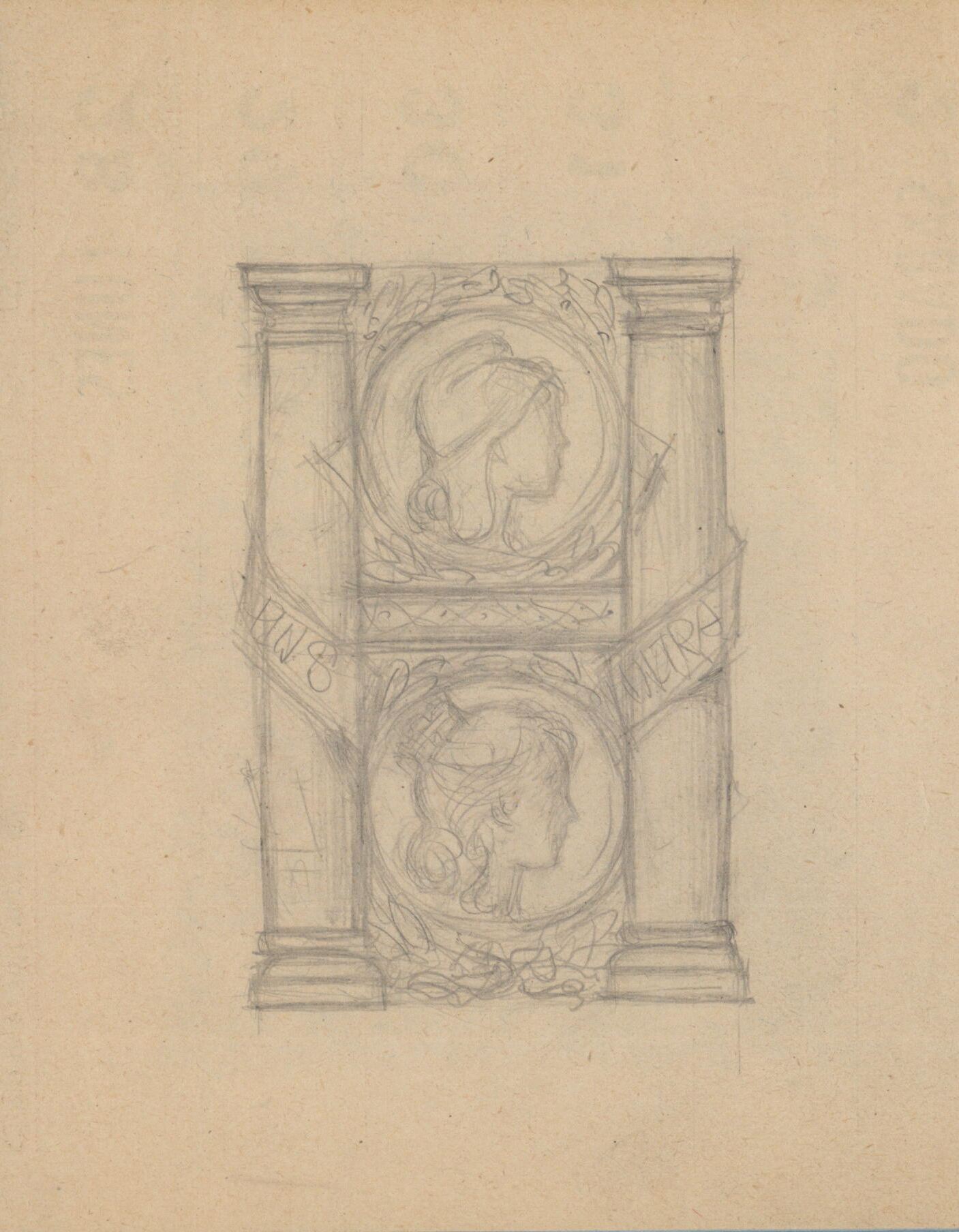 - Boceto a lápiz de los retratos de perfil de dos mujeres de época, rodeadas por coronas de laurel y enmarcadas por dos columnas laterales con capitel.Estudio para una posible medalla. Sin referencias.