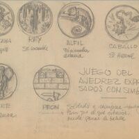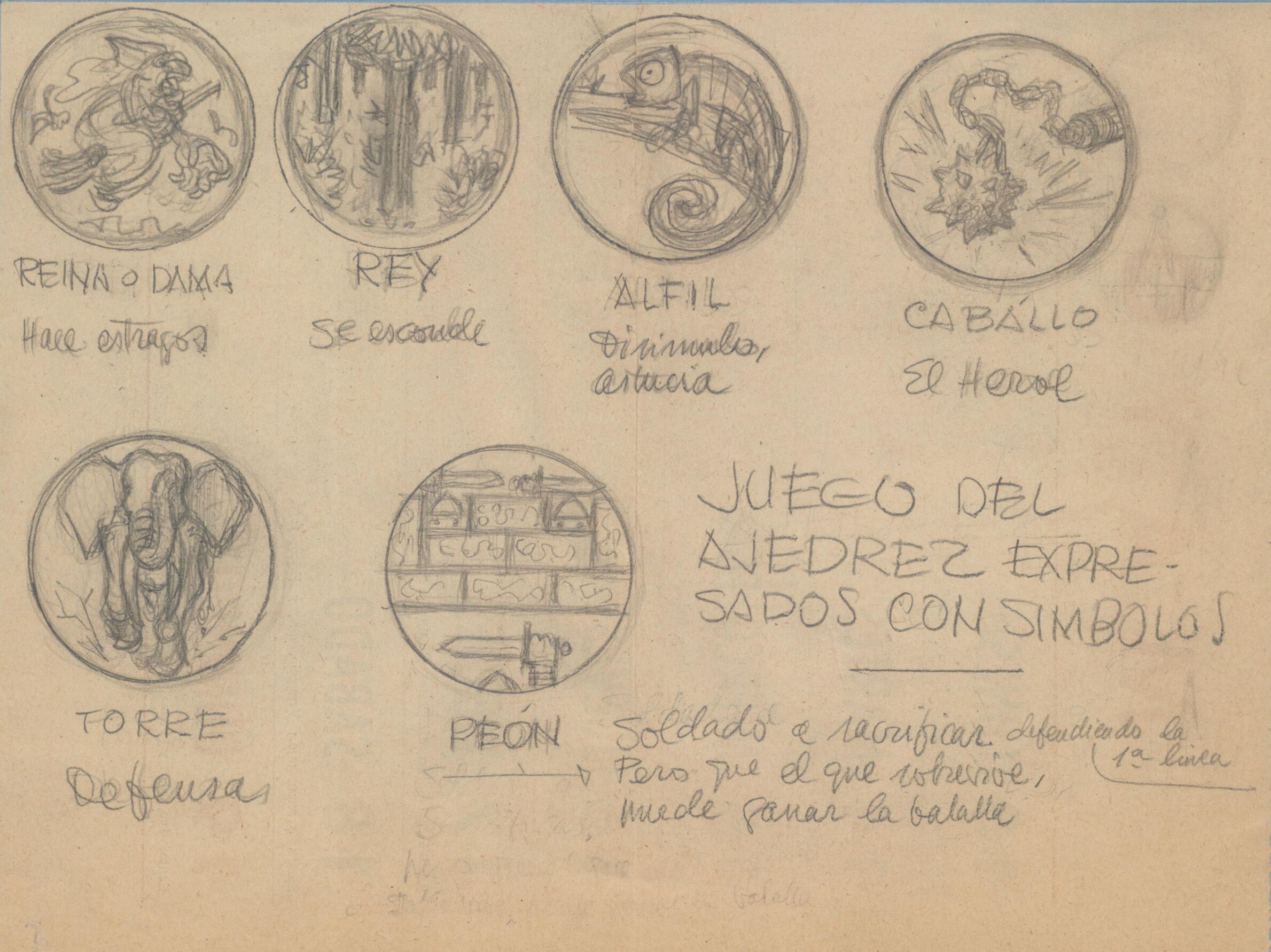 Boceto a lápiz de las piezas claves en el juego del ajedrez, cada una e ellas representadas simbólicamente, la reina o dama por una bruja volando en su escoba, el rey con la imagen de un bosque y él escondido detrás de un tronco, el alfil representado por un camaleón, el caballo por una maza medieval, la torre por un elefante como signo de defensa y el peón por un grupo de soldados medievales escondidos entre las almenas de un castillo.bocetos de reversos sobre el tema del Ajedrez. Sin Referencias