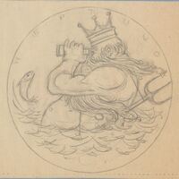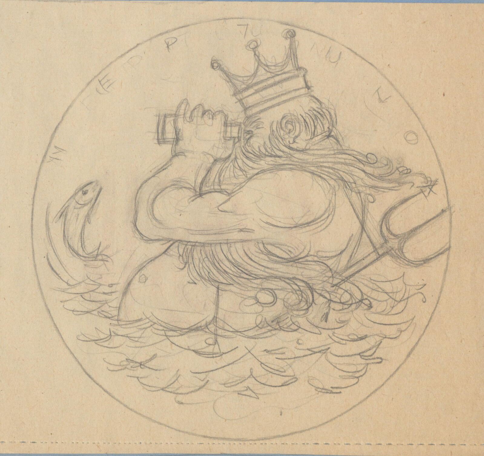 - Boceto a lápiz de la cara de una medalla donde se representa la figura del dios Neptuno, con grandes barbas, saliendo del mar con tridente y corona mirando a través de unos prismáticos.Proyecto de futura medalla sobre Neptuno. Sin referencias.