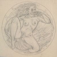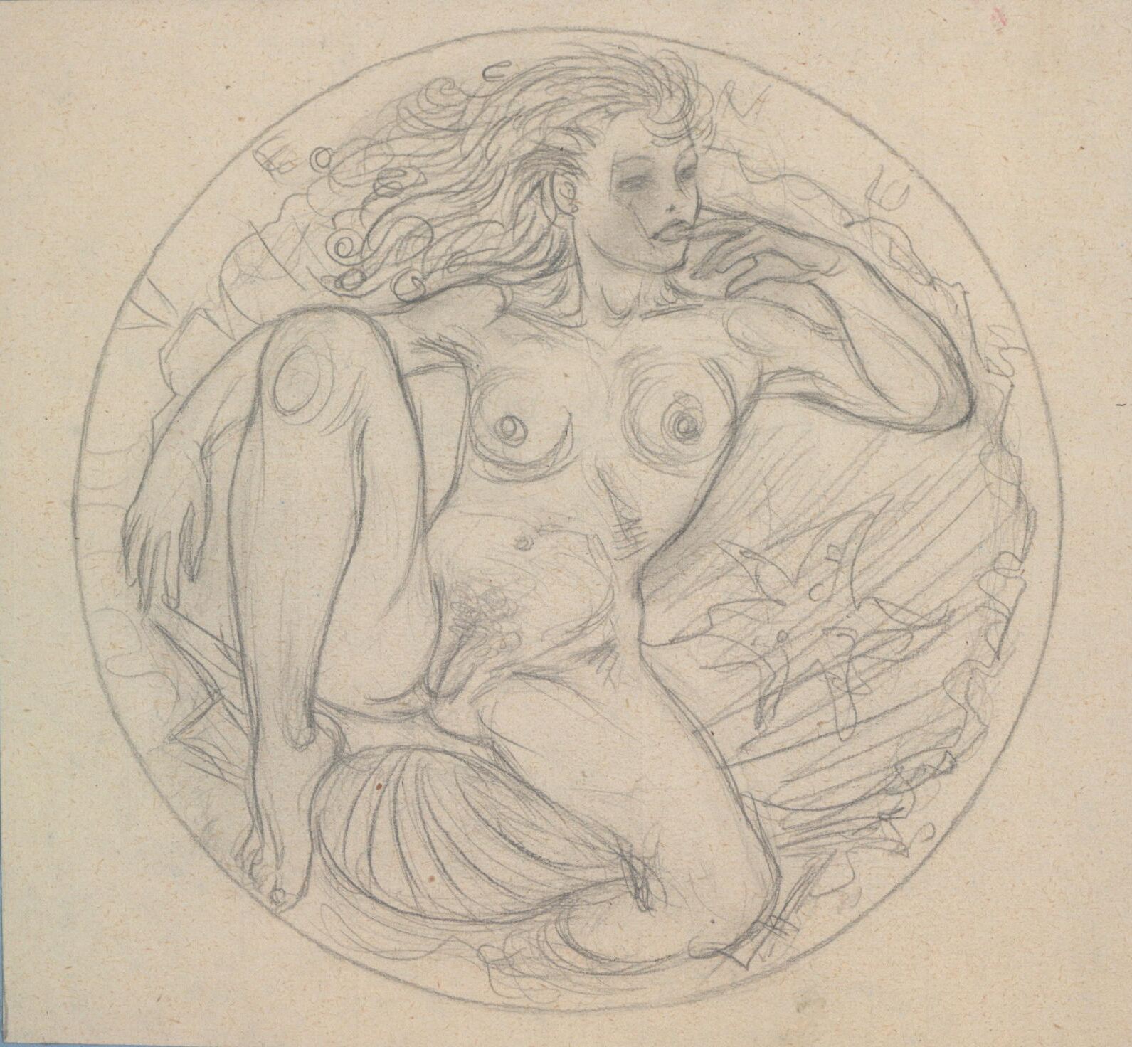 - Boceto a lápiz de la cara de una medalla donde se ve la figura de la diosa Venus, representada por medio de la imagen de una mujer desnuda sentada sobre una gran concha.Serie de la colección erótica de Manolo Prieto.