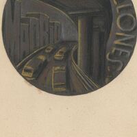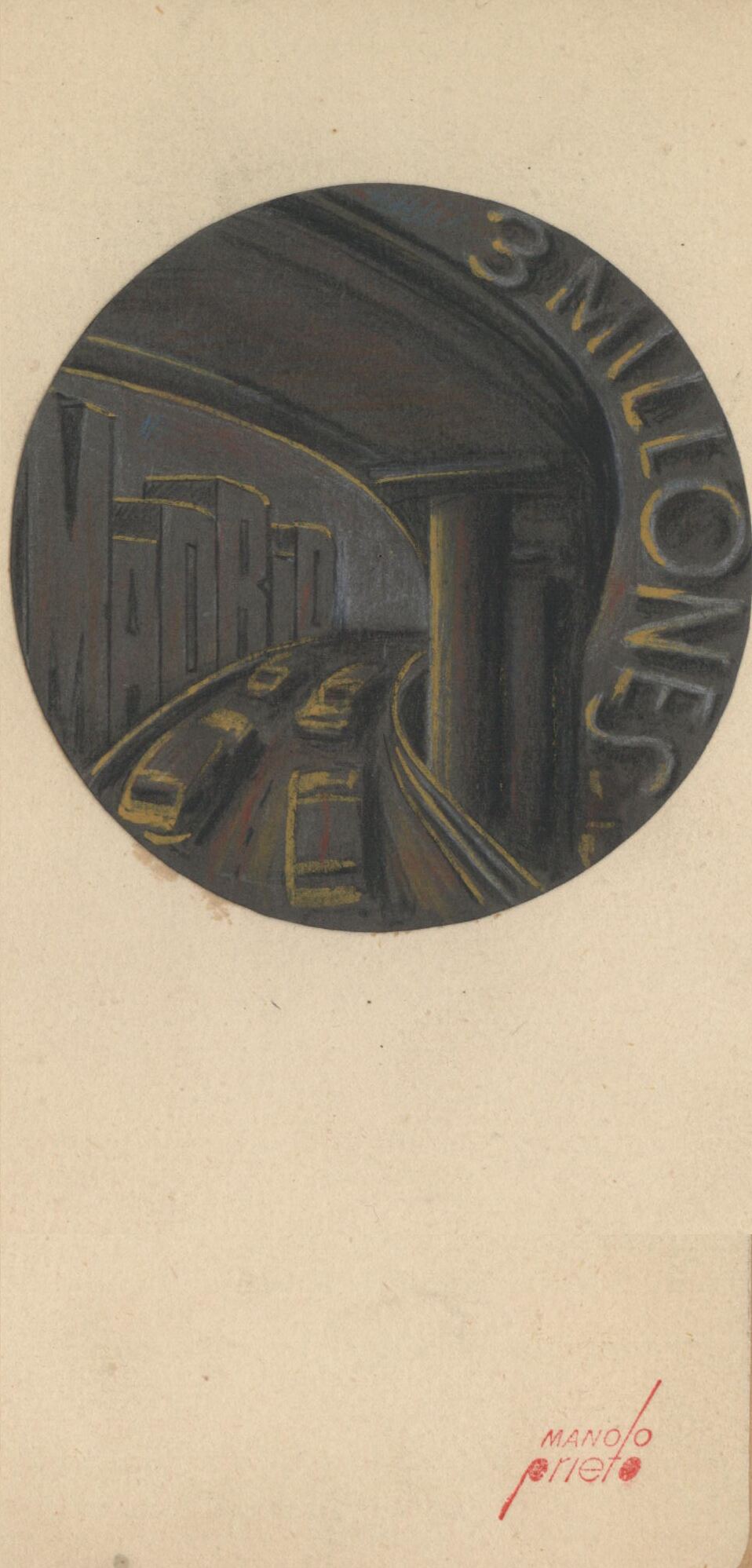 - Dibujo de una medalla de Madrid, que remarca la población alcanzada de tres millones convirtiéndola en una gran ciudad capaz de albergar tal importante número de habitantes, con la representación de un puente sobre el que circulan coches y en cuyos lados se aprecia los rótulos en grande del nombre de la ciudad y de los habitantes.