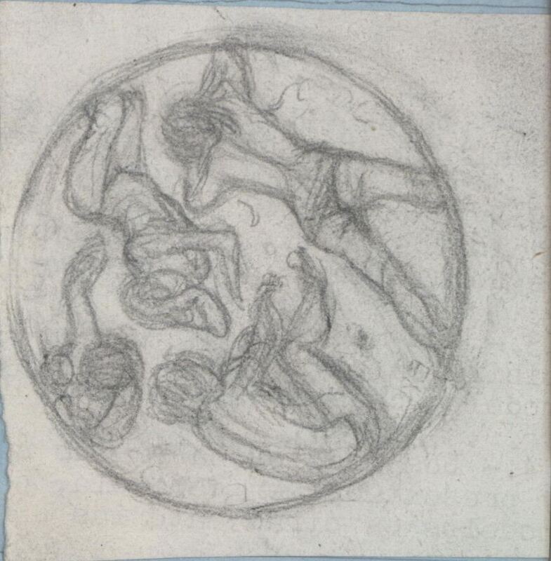 - Boceto a lápiz de la cara de una medalla que representa a un grupo de mujeres con traje de baño tumbadas tomando el sol y disfrutando. Parece que el punto de vista esta tomando desde lo alto.