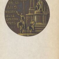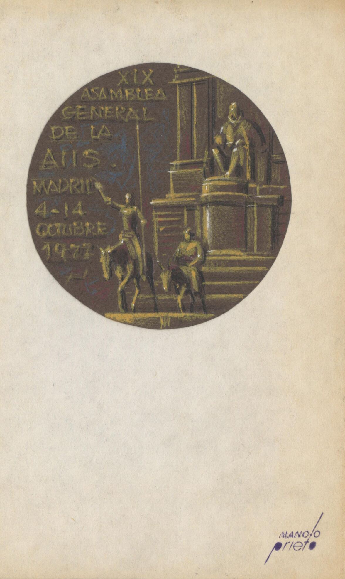 - Anverso de la medalla conmemorativa del XIX Asamblea General, con la escena de una escalinata en la que aparece Quijote y Sancho, y la que podría ser la esfinge de don Miguel de Cervantes.