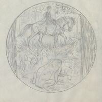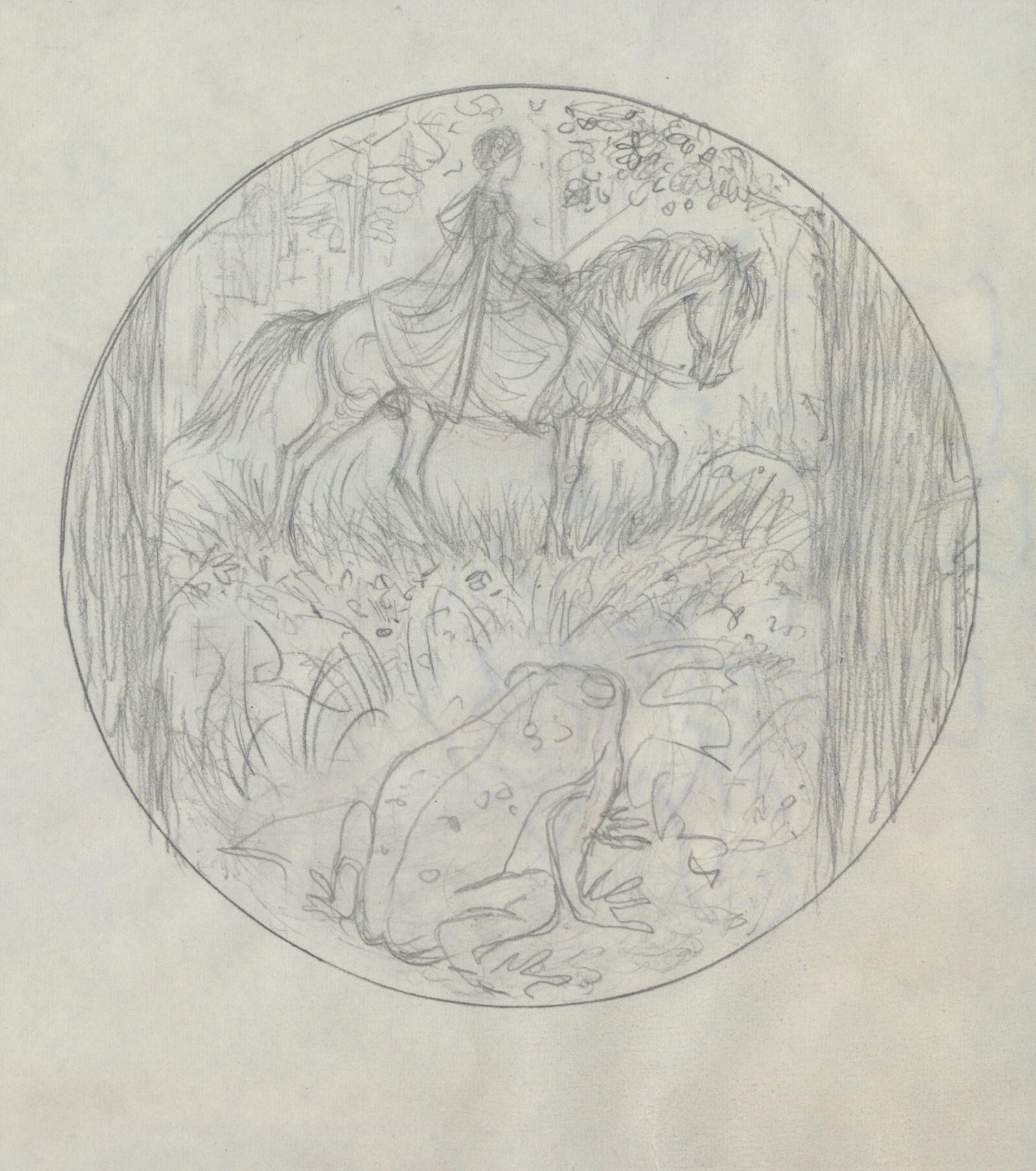 - Boceto a lápiz de una medalla donde se representa la escena de una mujer de época medieval en un caballo cruzando un bosque donde en primer término una rana que observa atentamente la escena.