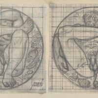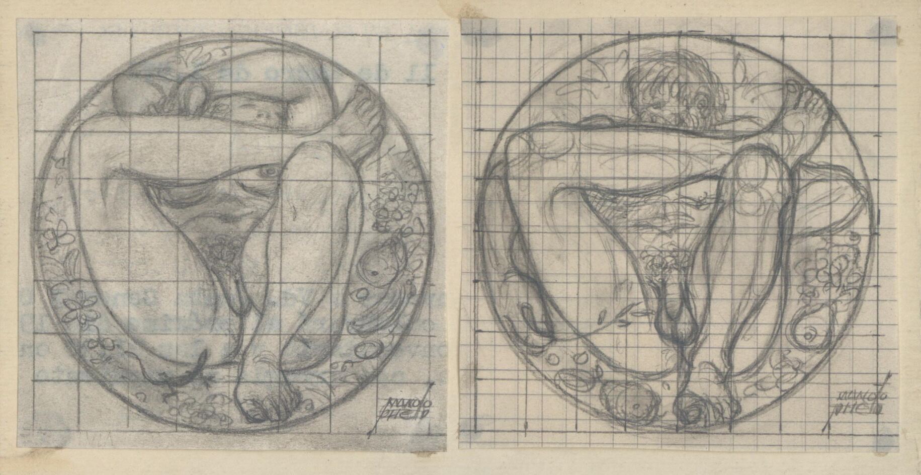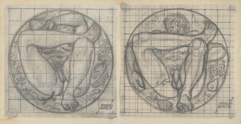 - Boceto a lápiz de las caras de una medalla donde se representa a un hombre dormido, placidamente sobre la hierba con una de las piernas sobre su rodilla, en el lado de la derecha, y una mujer en el de la izquierda.