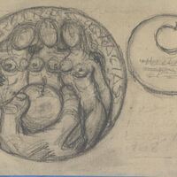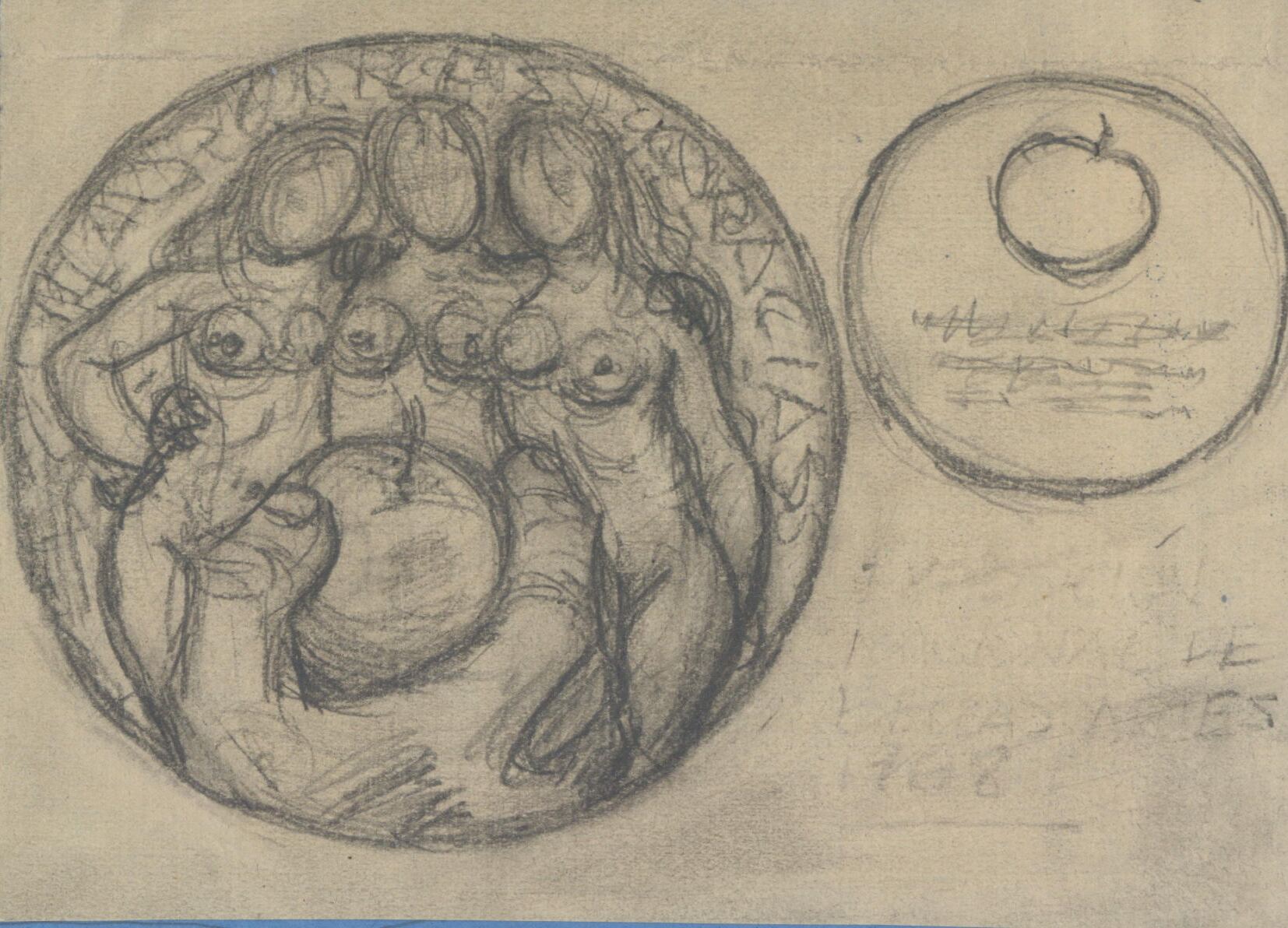 - Boceto a lápiz de la cara de una medalla con la escena de tres mujeres desnudas, las tres gracias, que esperan atentamente a quién de ellas elegirá Paris como la más bella, y le dará la manzana.