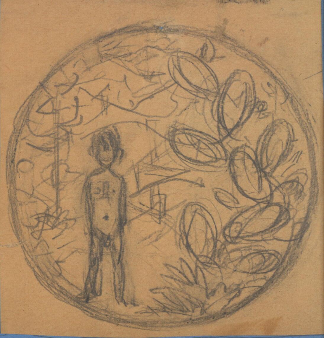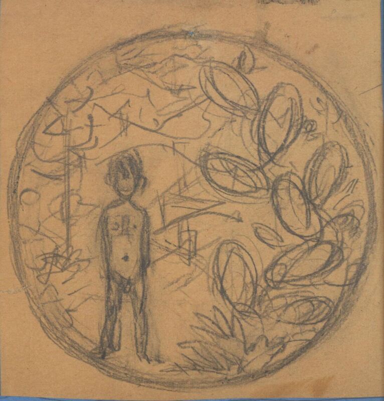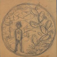 - Primer boceto de una de las caras de una medalla donde se aprecia en primer término la figura de un niño de frente desnudo junto a trazos sueltos y rápidos sin definir. Podría ser un niño viendo un acuario.