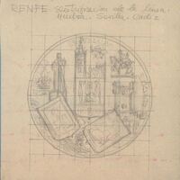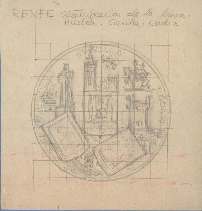 - Boceto a lápiz sobre fondo cuadriculado de una medalla representativa de la líneas de RENFE, abiertas en Huelva Sevilla y Cádiz, con el conjunto de monumentos y escudo representativos de cada uno de las ciudades.