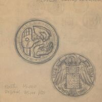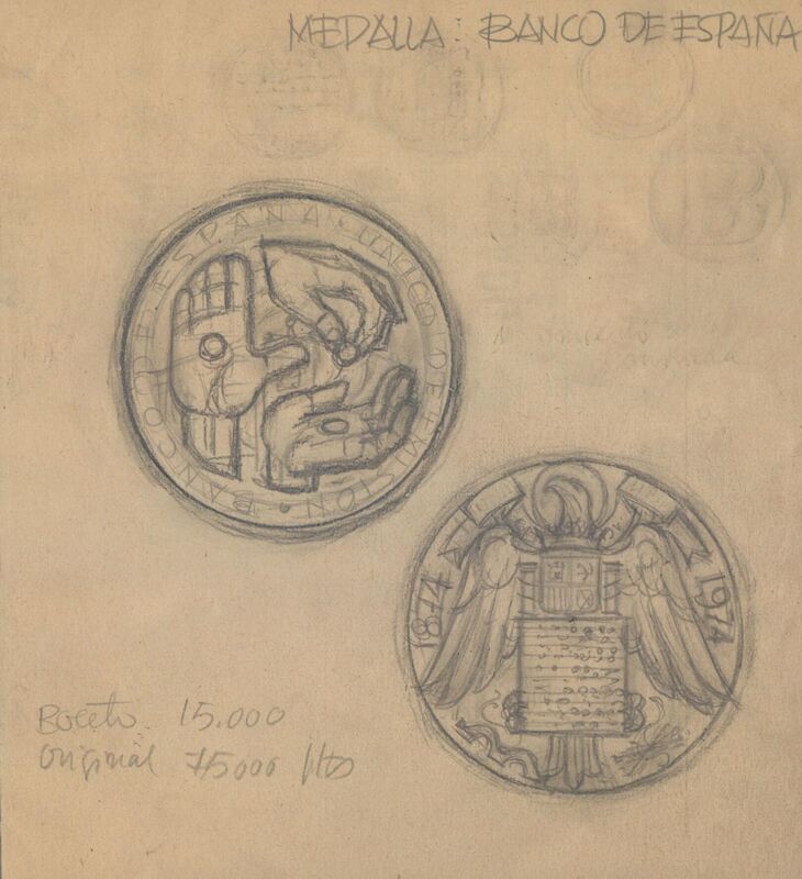 - Boceto a lápiz de las caras de la medalla representativa del Banco de España, con la imagen de un escudo con el águila imperial junto a una de las caras donde se aprecia unas manos con las palmas extendidas esperando recibir el reparto de monedas.