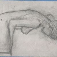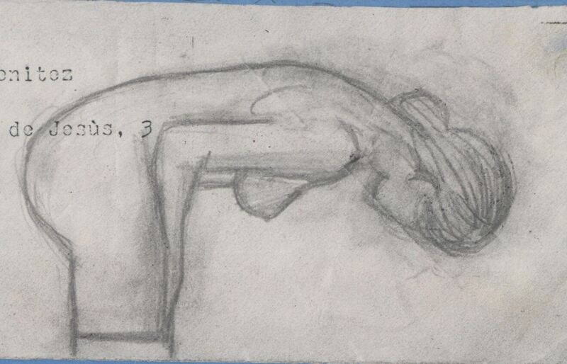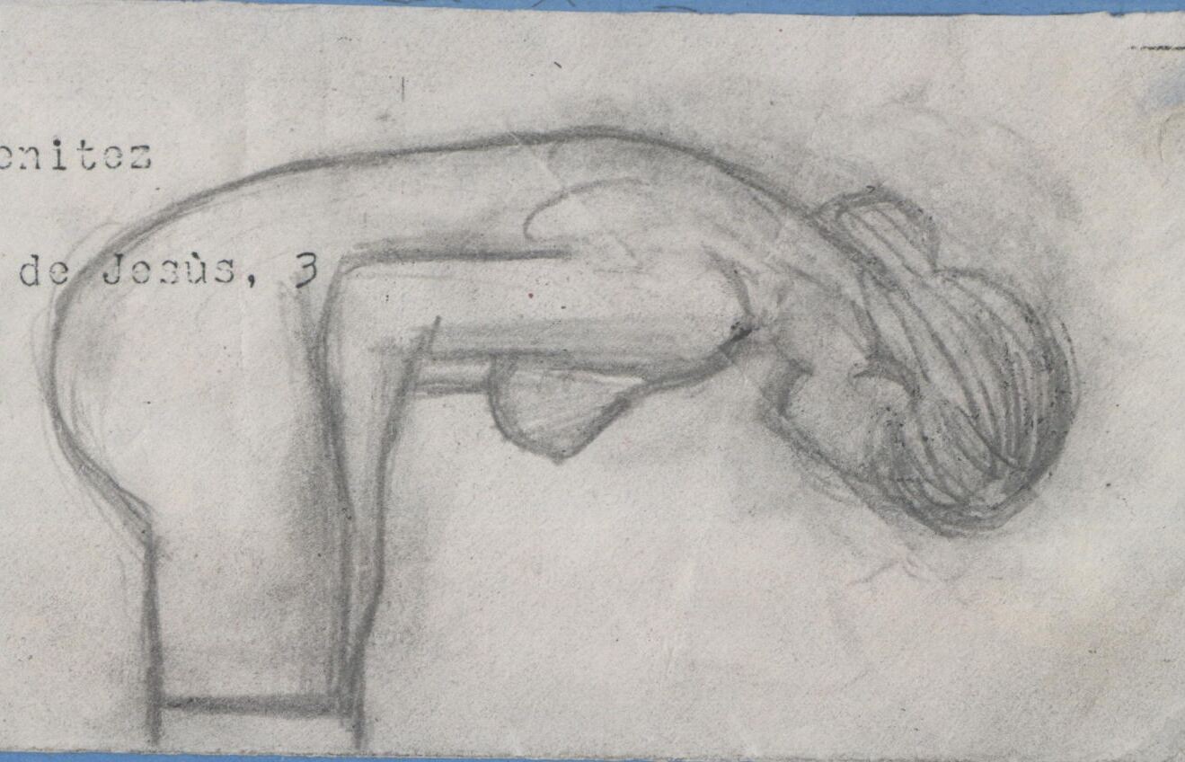 - Boceto a lápiz del desnudo de una mujer que se inclina sobre sus muslos creando una postura en L inversa semejante al puño de un bastón. Está dibujada sobre un papel que había sido utilizado por una máquina de escribir.
