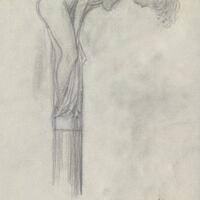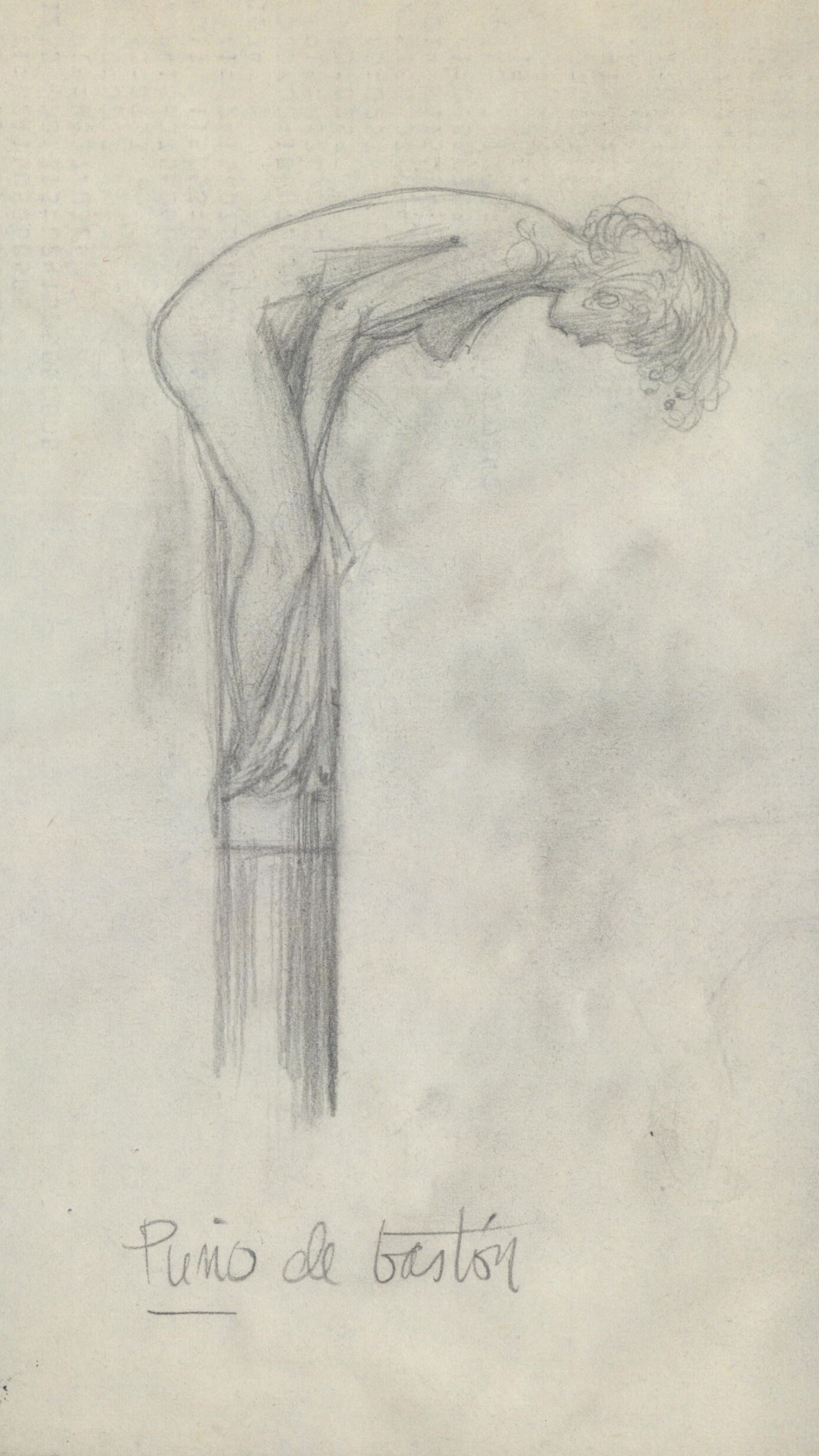 - Boceto a lápiz del estudio de un puño de bastón donde se aprecia el dibujo de una mujer desnuda con la espalda inclinada hacia delante mientras que el resto del cuerpo forma un todo con el fuste largo donde está subida, imitando la forma de un bastón.