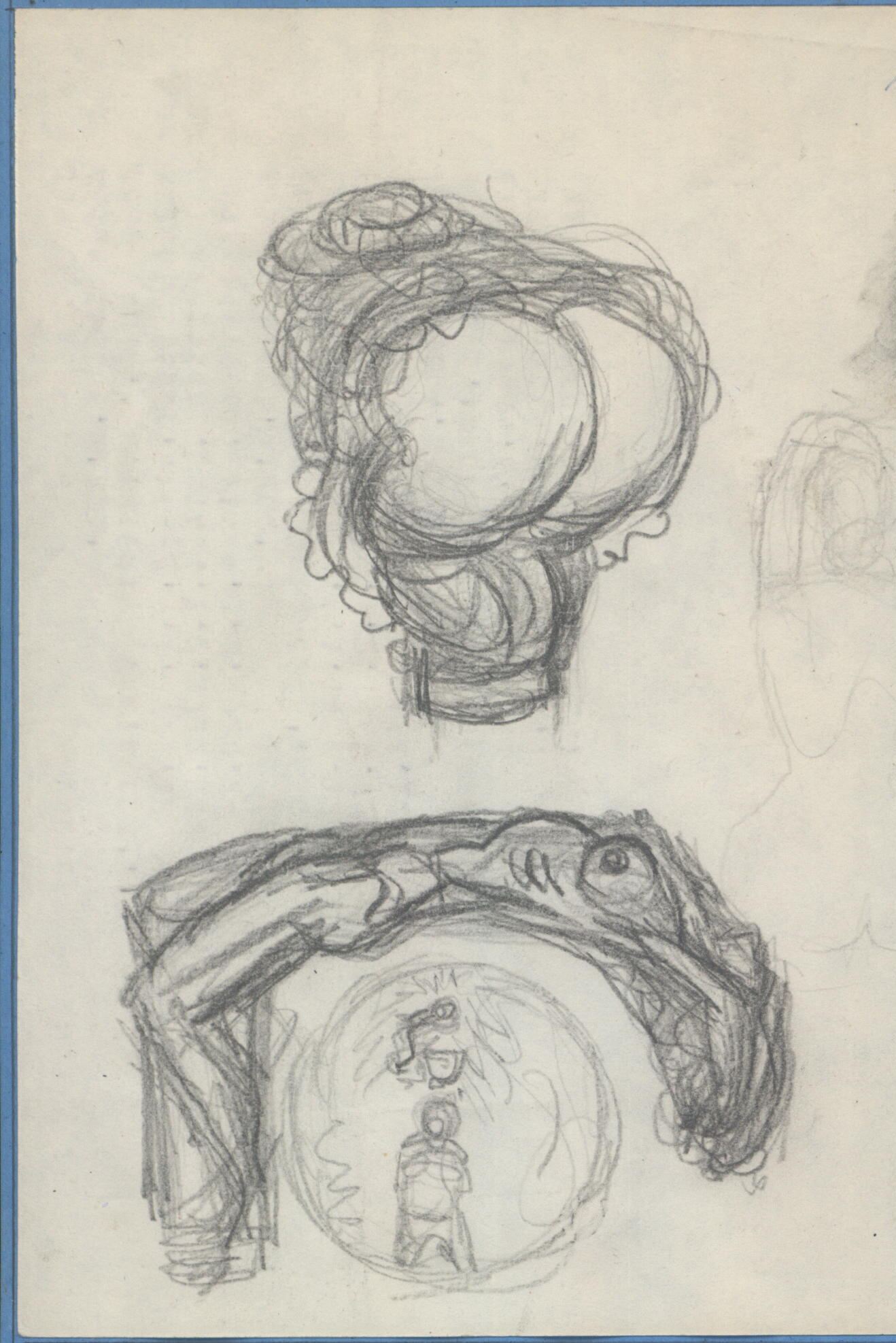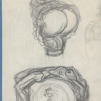 - Apuntes a lápiz de diferentes remates de un bastón, uno de ellos perfila la figura de espaldas de una mujer en situación comprometida junto al estudio del desnudo de una mujer boca arriba cuyo cuerpo se acopla a la forma del puño de un bastón.