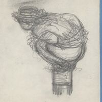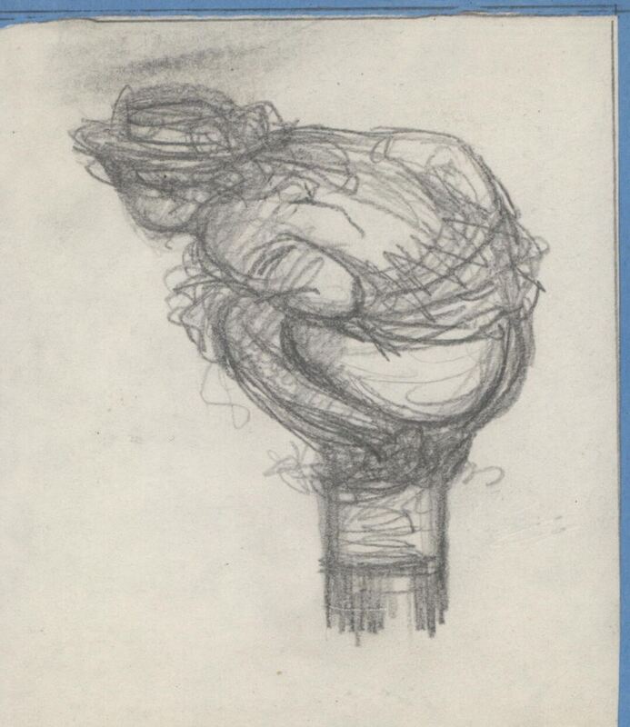 - Apunte a lápiz del boceto de un puño de bastón conformado por un fuste rematado con la figura de una mujer en situación comprometida. El boceto de la escultura es directamente cómico.