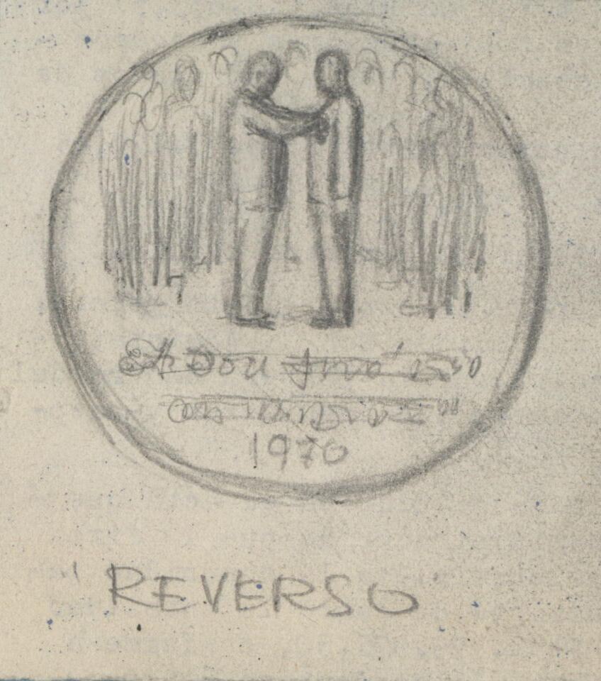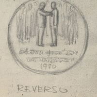 - Boceto a lápiz del reverso de una medalla donde se representa la escena con protagonistas centrales, donde uno de ellos condecora al otro con una medalla rodeados por una multitud de personas.