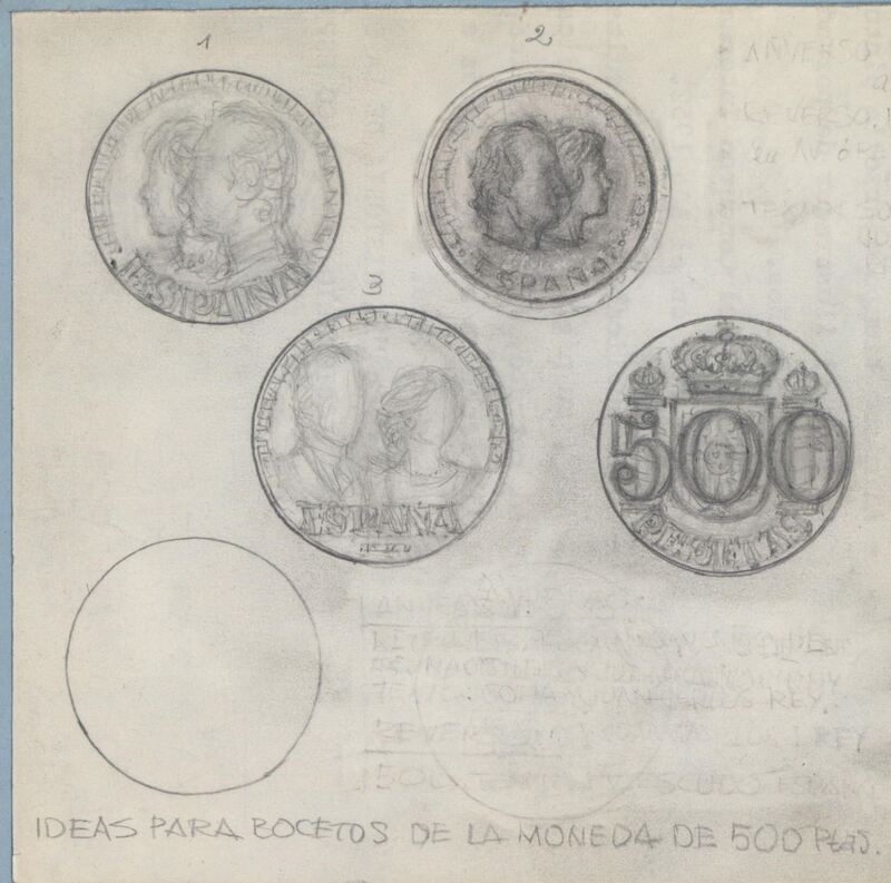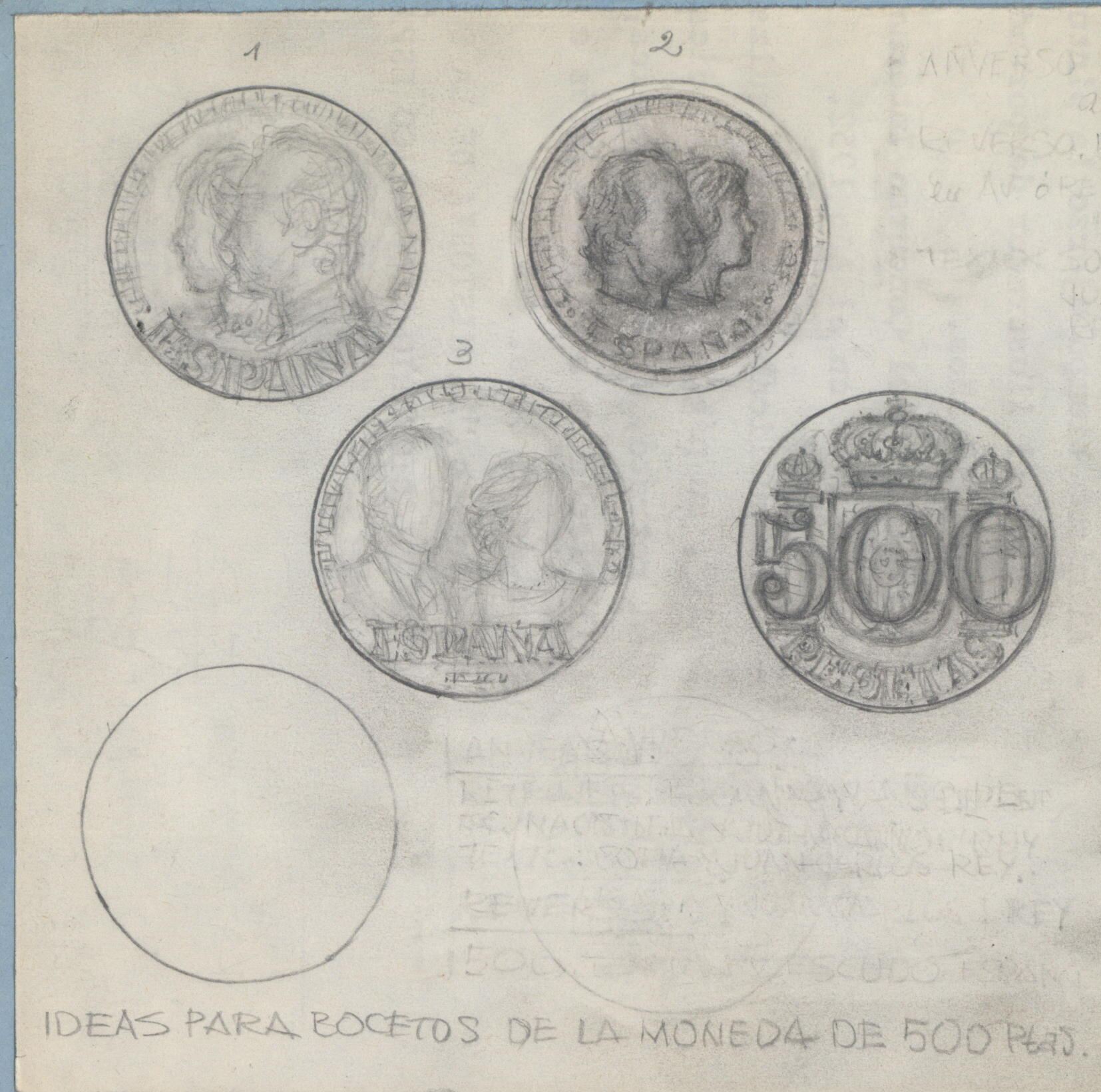 - Apuntes a lápiz de un conjunto de ideas para bocetos de las monedas de quinientas pesetas, con los retratos de los actuales reyes de España, don Juan Carlos y doña Sofía, en diferentes posiciones.