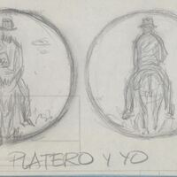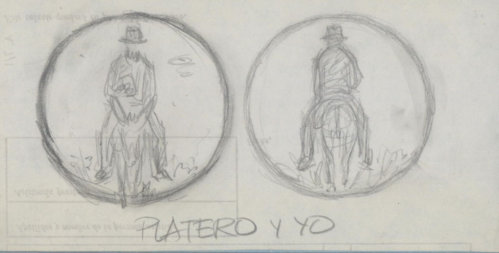- Boceto a lápiz del anverso y reverso de una medalla cuya temática es Platero y yo con la representación de la figura de un hombre maduro visto de frente y de espaldas montado sobre el lomo de un burro.boceto estudio sobre medalla para el tema Platero y Yo.Otros archivos relacionados: MBO/559-686. Sin otraqs referencias.