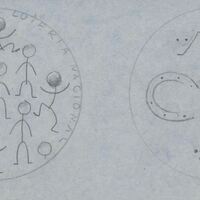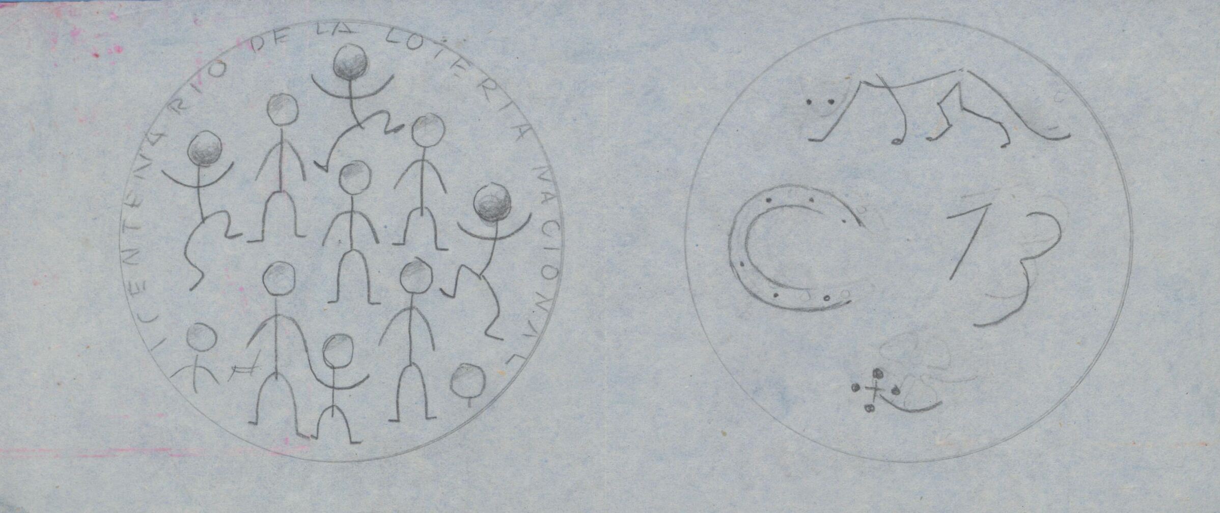 - Boceto a lápiz de la medalla representativa de la Lotería Nacional con dibujos esquemáticos, en una de las caras se aprecia a un grupo de hombres acompañados de sus hijos que ocupan todo el campo de la medalla junto al reverso con el número trece, una herradura y la silueta de un perro.