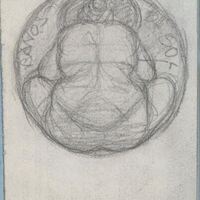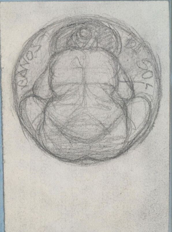 - Primer boceto de una de las caras de una medalla, donde se aprecia el dibujo de una mujer corpulenta de espaldas con un gran sombrero disfrutando del sol. El trasero y las piernas modelan la medalla por la parte baja.