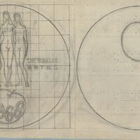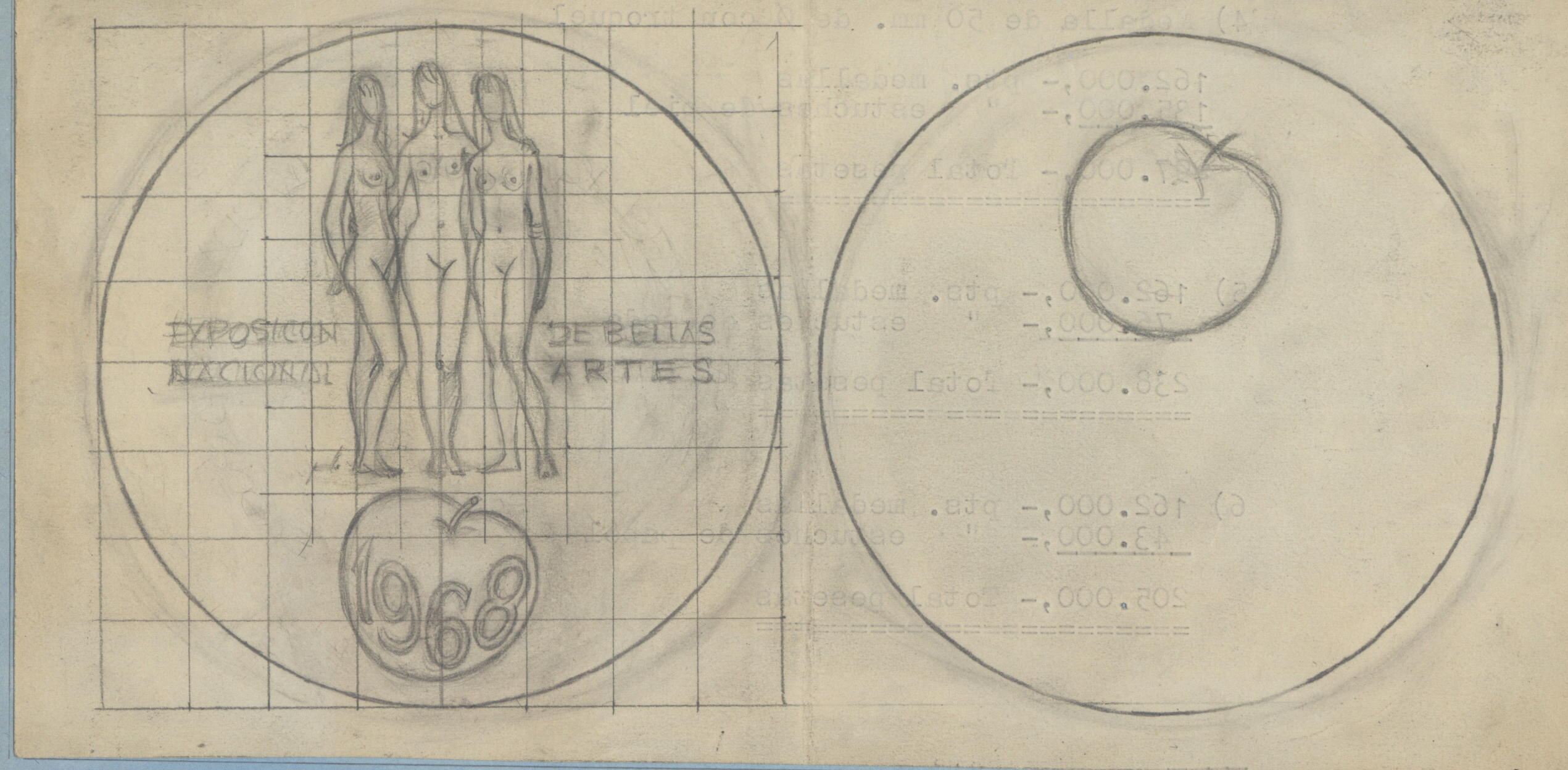 - Primer boceto a lápiz sobre fondo cuadriculado de las caras de una medalla representativa de la Exposición Nacional de Bellas Artes celebrada el año 1968, en una de las caras el dibujo de tres mujeres desnudas frente a una manzana en primer término en cuya piel se observa la fecha de la exposición junto al dibujo de una manzana.