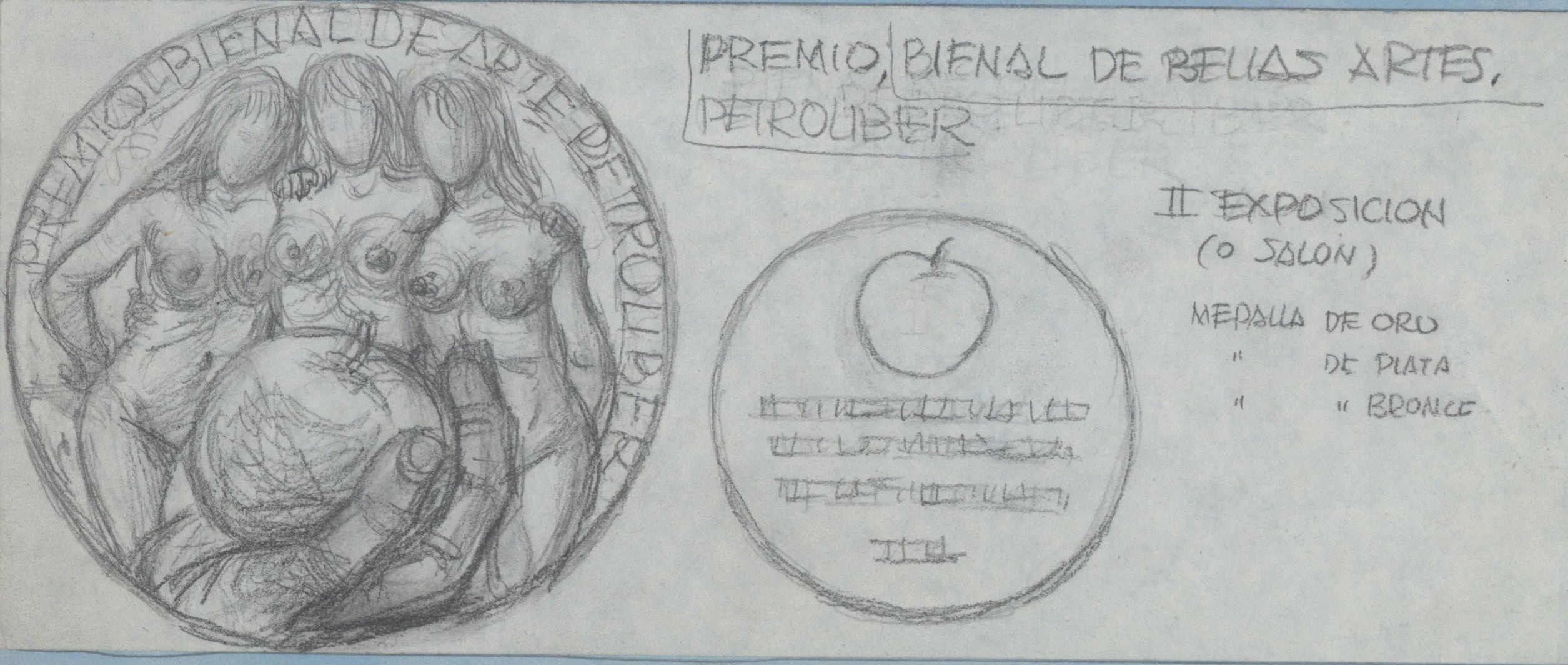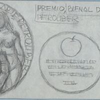 - Boceto a lápiz sobre fondo cuadriculado de las caras de una medalla representativa de la Exposición Nacional de Bellas Artes celebrada el año 1968, en una de las caras el dibujo de tres mujeres desnudas frente a una manzana en primer término sujeta por una mano junto al dibujo de una manzana y la leyenda correspondiente.