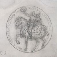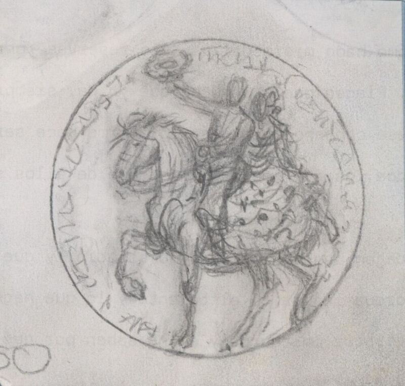 - Boceto a lápiz de una medalla representativa de Sevilla, donde se aprecia el dibujo de una pareja vestida con trajes típicos de Andalucía sobre un caballo, donde el hombre saluda con el sombrero en su mano.