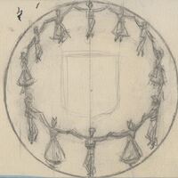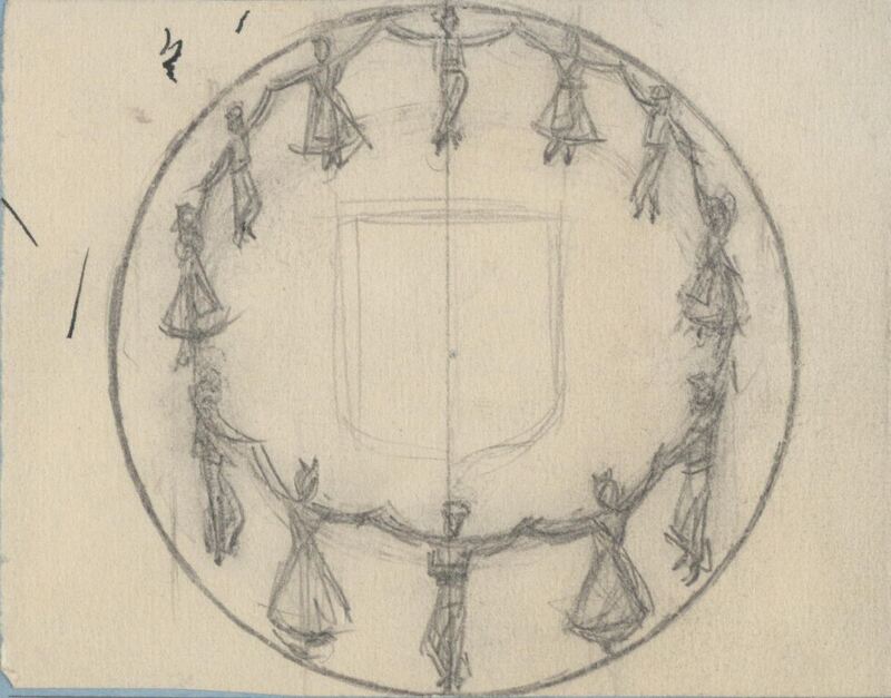 - Primer boceto de la cara de una medalla donde todo su contorno está ocupado por un grupo de hombres vestidos con trajes típicos que cogidos entre sí forman un círculo en cuyo centro se aprecia la silueta de un escudo.