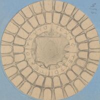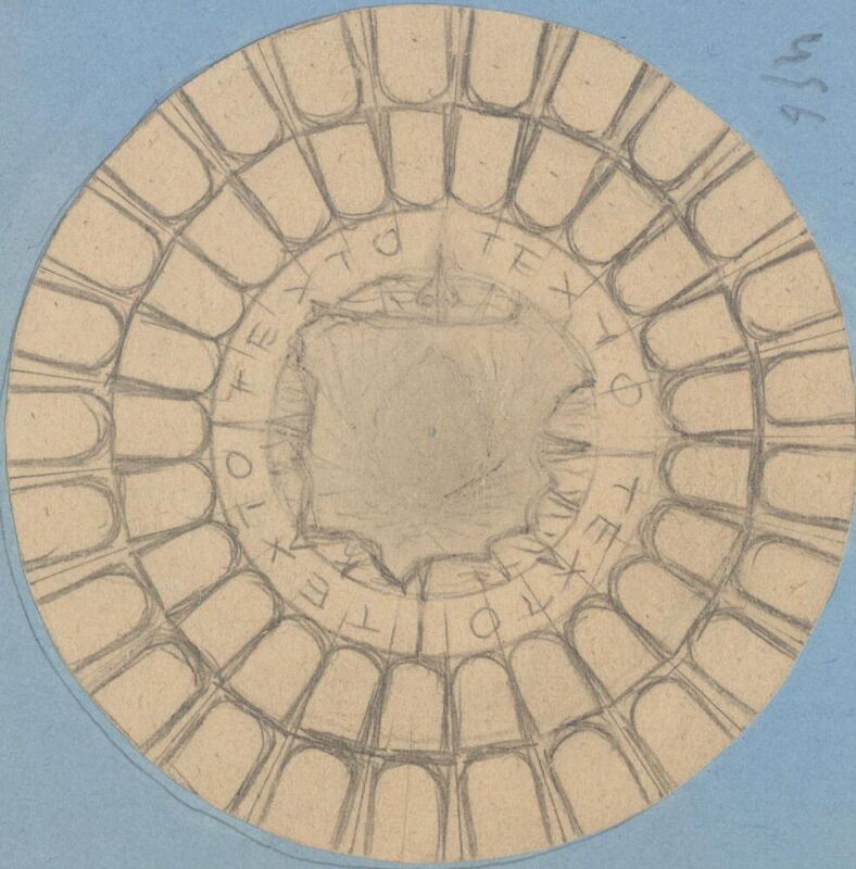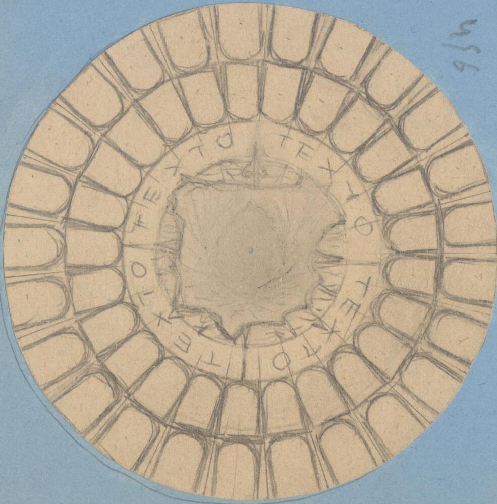 - Boceto a lápiz de la cara de una medalla donde se representa el mapa geográfico de la península sobre un fondo simétrico de dos filas de arcos que recuerda a los arcos de un las gradas de un ruedo.