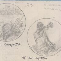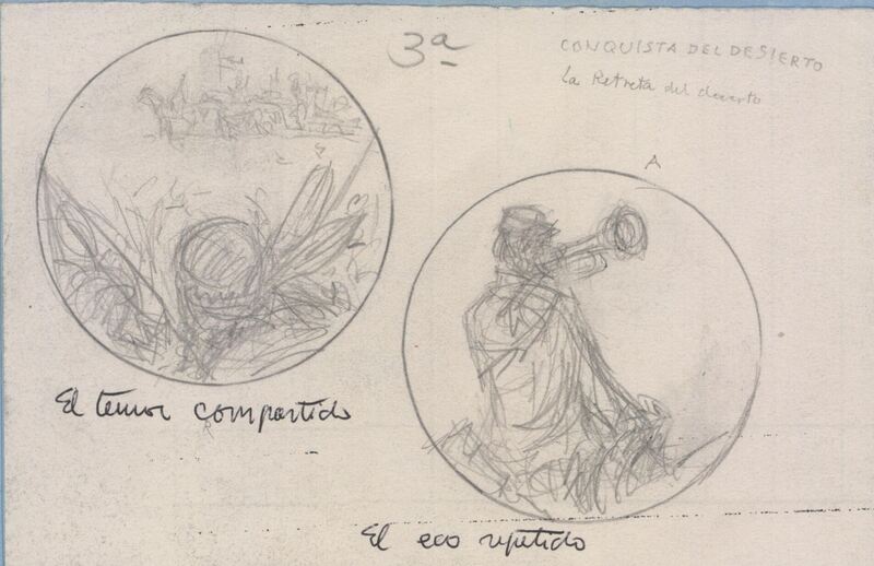 - Boceto a lápiz de las medallas relacionados con la temática de la conquista del desierto, una de ellas titulada “el temor compartido” con la imagen de la cabeza de un indio agazapado observando el paso de una tropa de soldados americanos, junto al dibujo de otra medalla titulada “el eco repetido” con la figura de un soldado a caballo tocando la corneta.