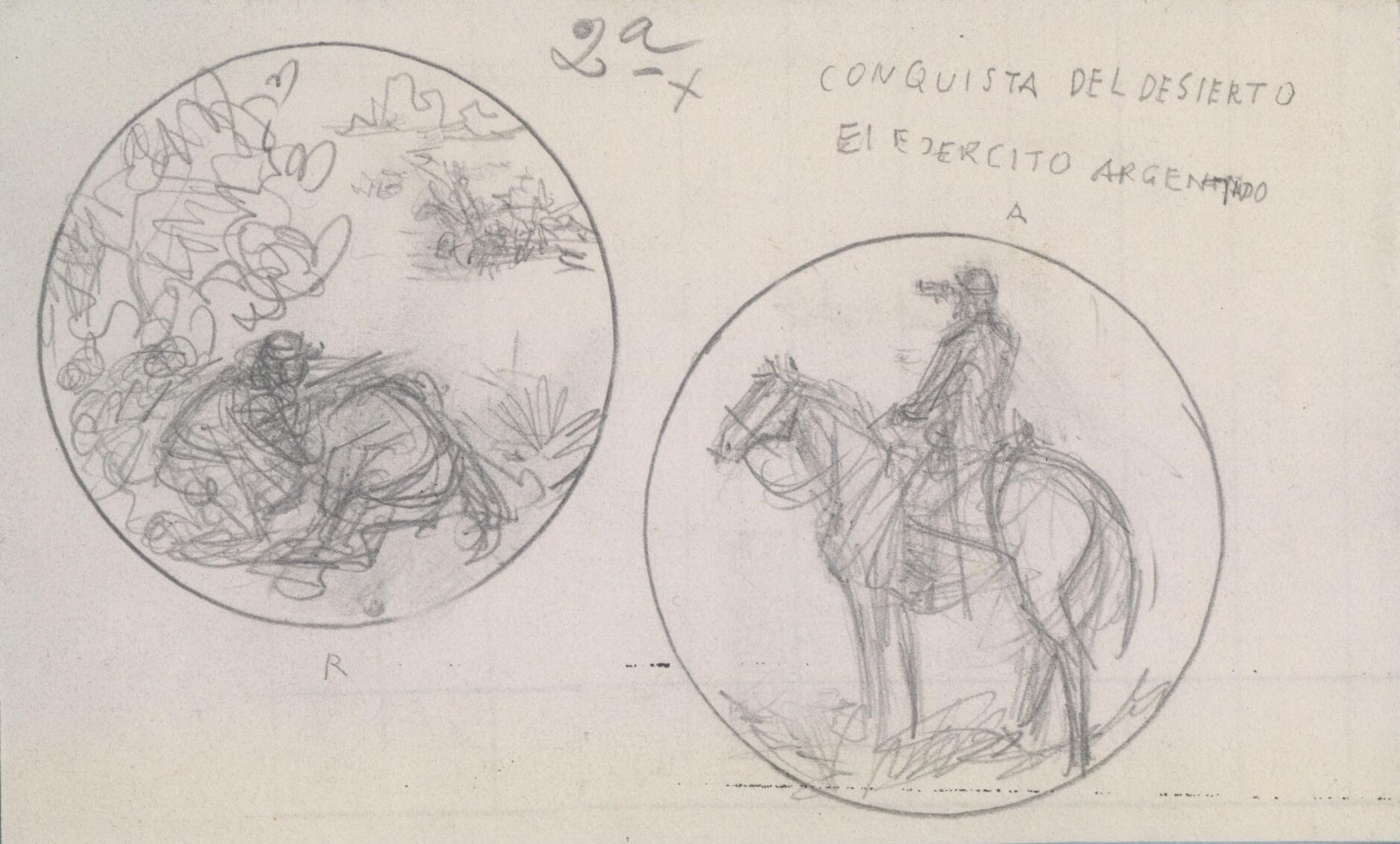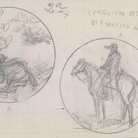 - Boceto a lápiz de unas medallas con la temática común de la conquista del desierto, en una de ellas se representa en primer término a un soldado escondido sobre el lomo de un caballo derribado que observa el ataque del enemigo, junto al dibujo de un soldado de perfil a caballo que mira hacia el horizonte.
