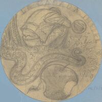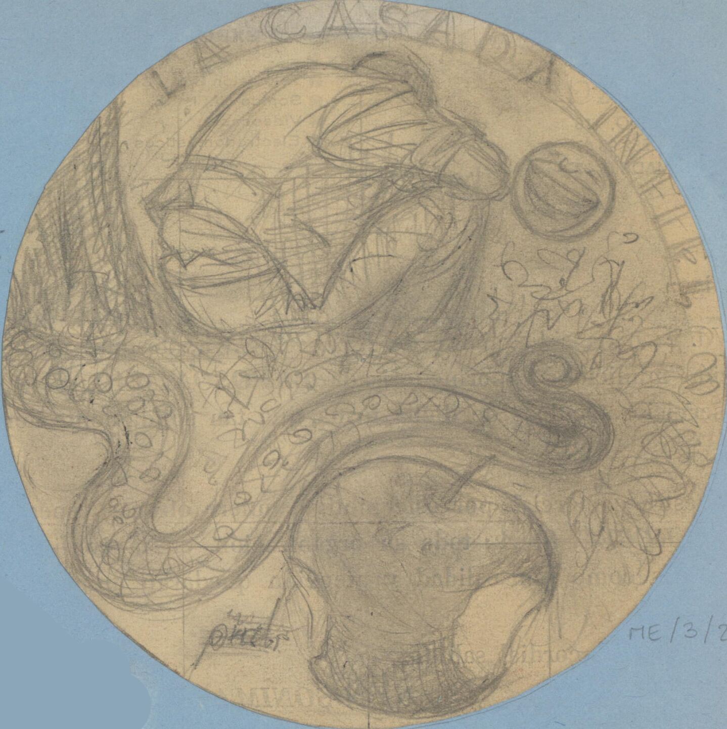 - Boceto a lápiz de una medalla titulada “La casada infiel” que representa a un hombre abatido junto a un tronco donde en primer término se aprecia a una gran serpiente junto a una manzana mordida, símbolo de la traición.