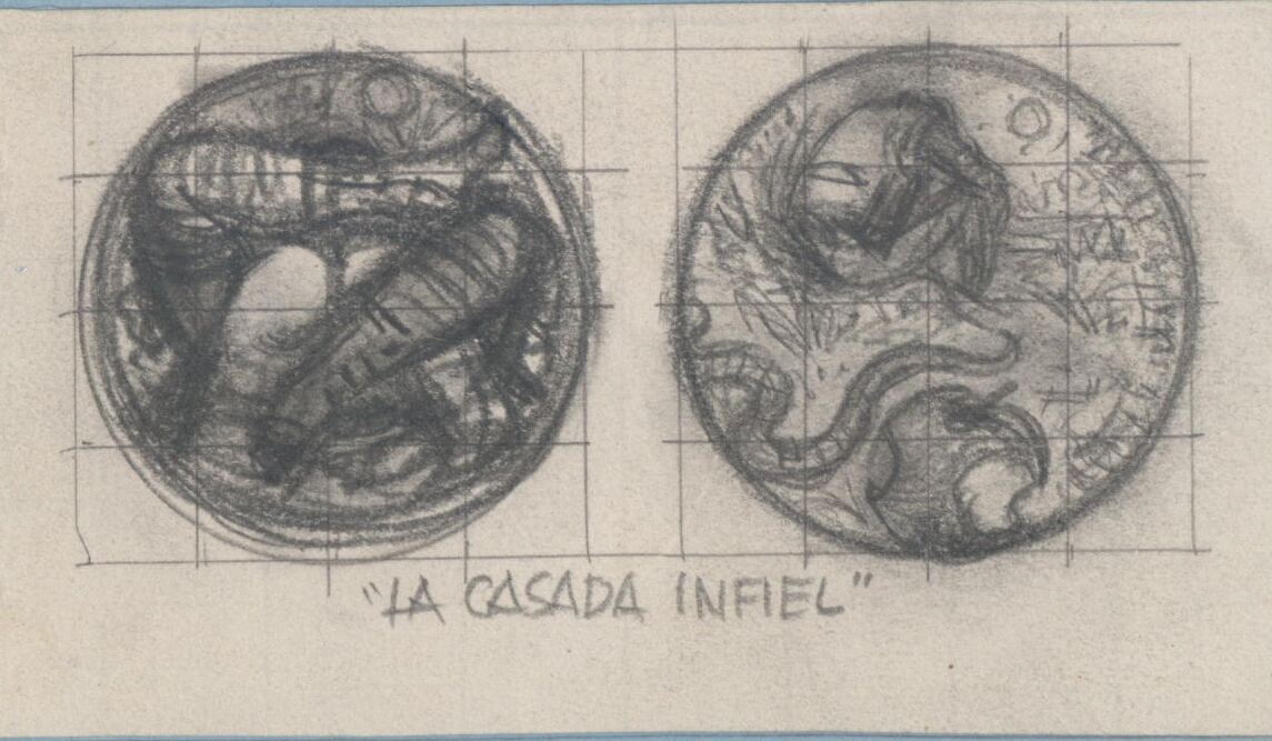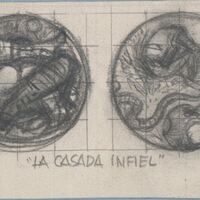 - Primer boceto de la medalla titulada “La casada infiel”, con trazos rápidos donde se puede apreciar en una de ellas la escena de un hombre abatido sentado junto al tronco de un árbol donde en primer término se observa una gran serpiente junto a una manzana mordida.