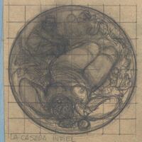 - Primer boceto de sobre fondo cuadriculado de la medalla titulada “La casada infiel”, con la imagen de una mujer desnuda recostada sobre el suelo en primer término y en el fondo de la escena un hombre sentado cogiendo sus rodillas con aptitud de abatimiento.