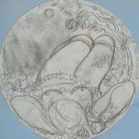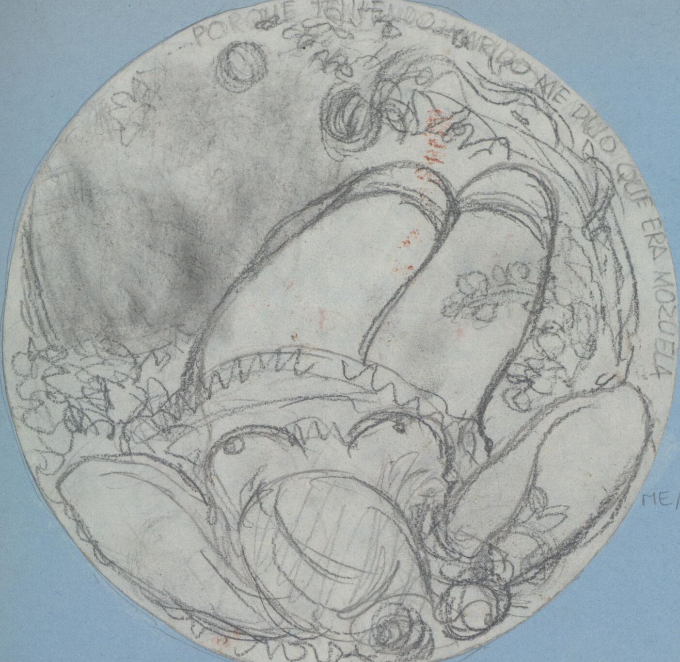 - Boceto a lápiz de una medalla donde se aprecia en primer término a una mujer tumbada en el suelo semidesnuda con la falda levantada con una aptitud un poco díscola; parece representa a Lolita.