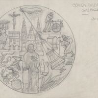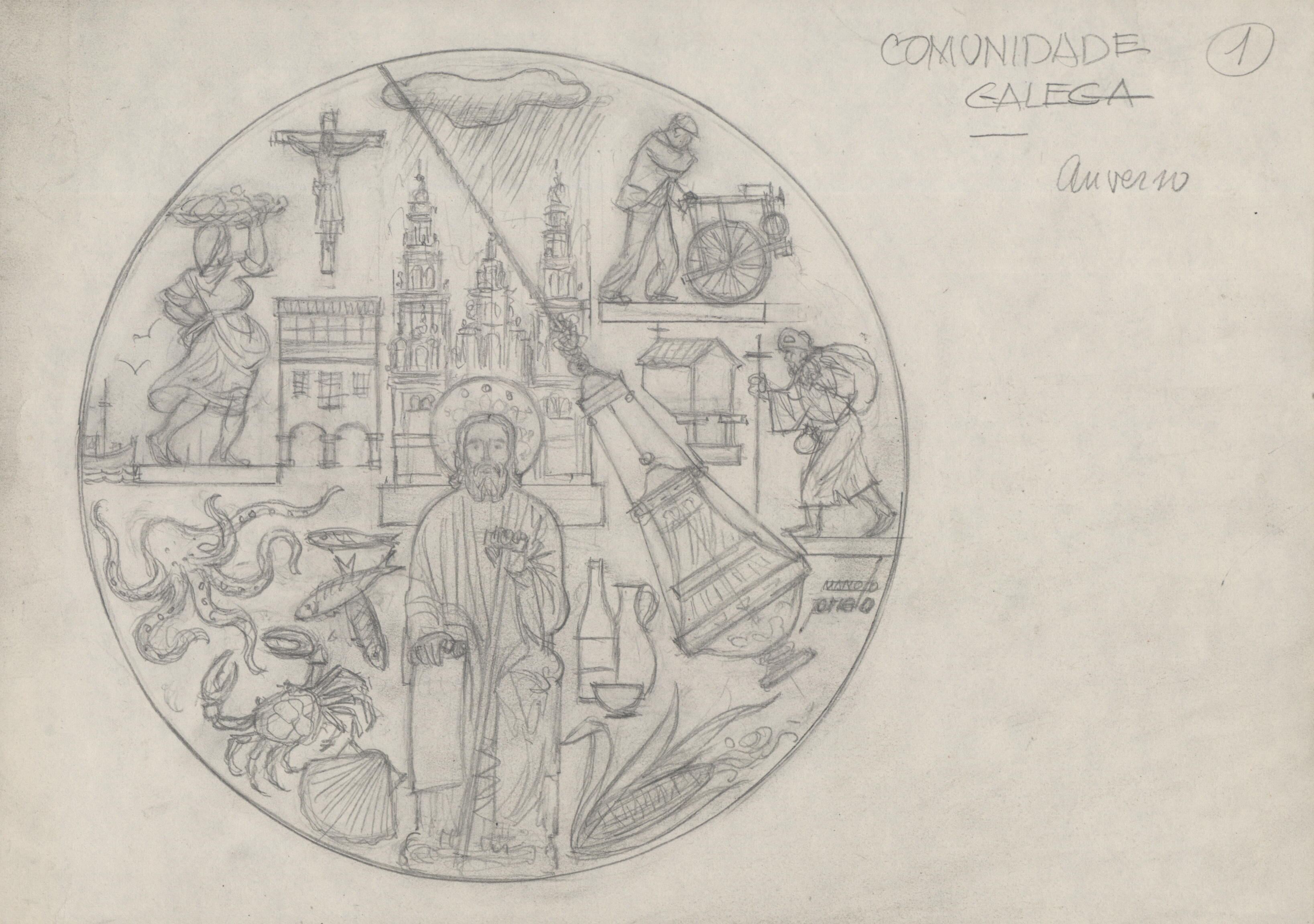 - Boceto a lápiz del anverso de la medalla de la Comunidad Galega con los monumentos, imágenes, símbolos, botafumeiro característicos de la región; arriba de todo, la eterna lluvia gallega representada por una nube.