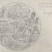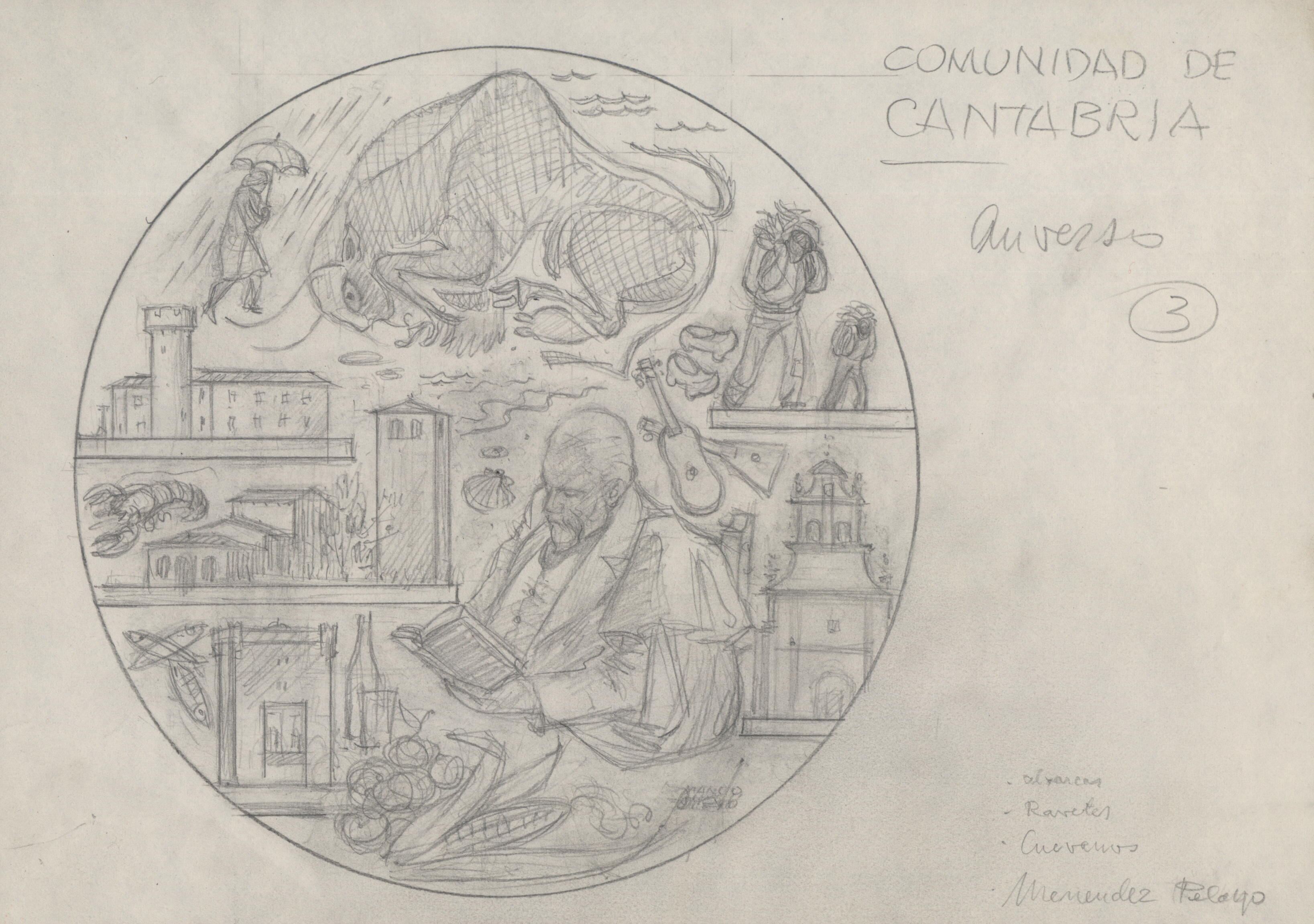 - Boceto a lápiz del anverso de la medalla conmemorativa de la Comunidad Cantábrica, con la figura de Don Marcelino Menéndez Pelayo, junto a un bisonte de Altamira y otros elementos significativos de la región.