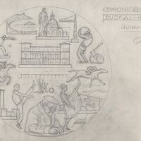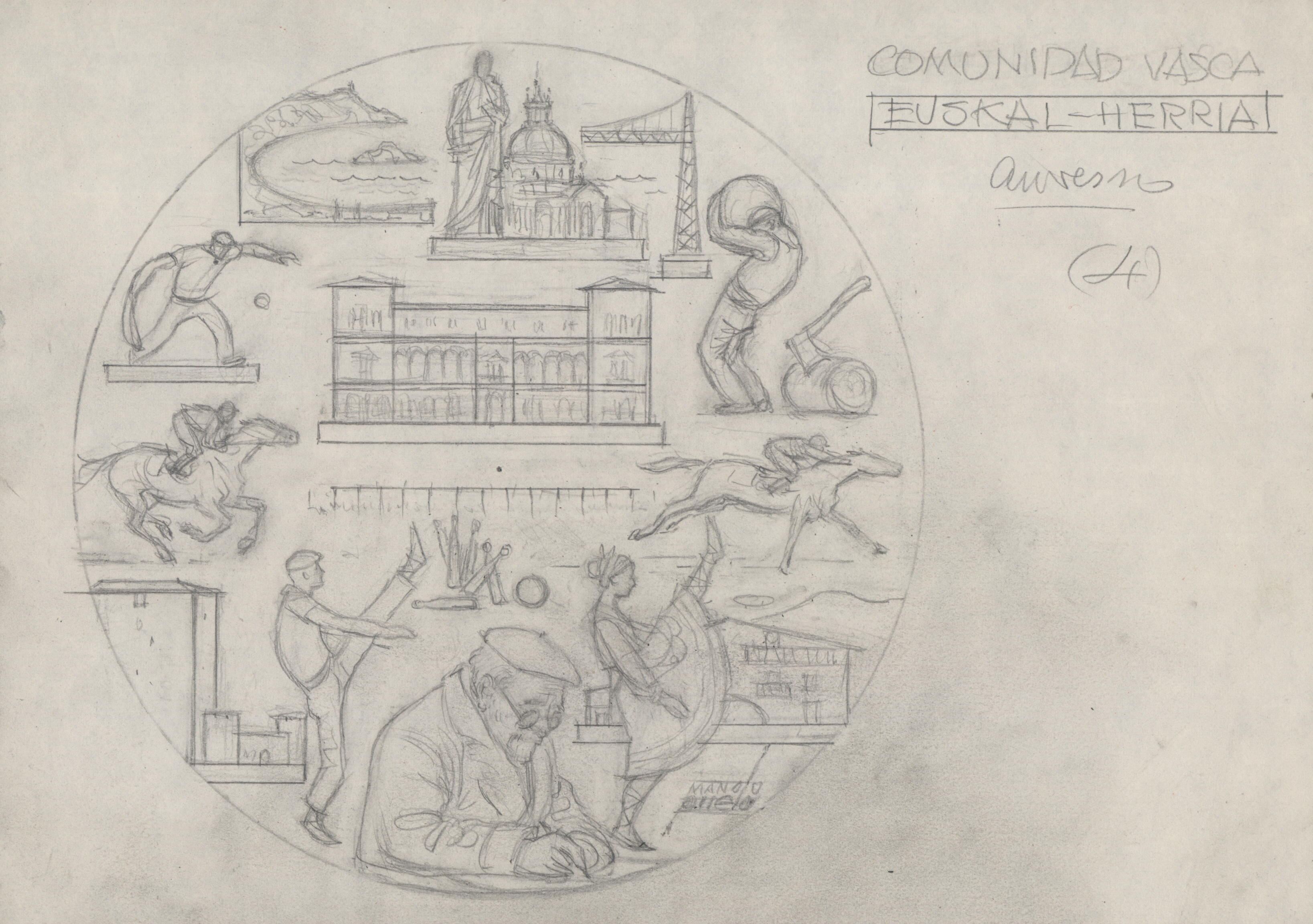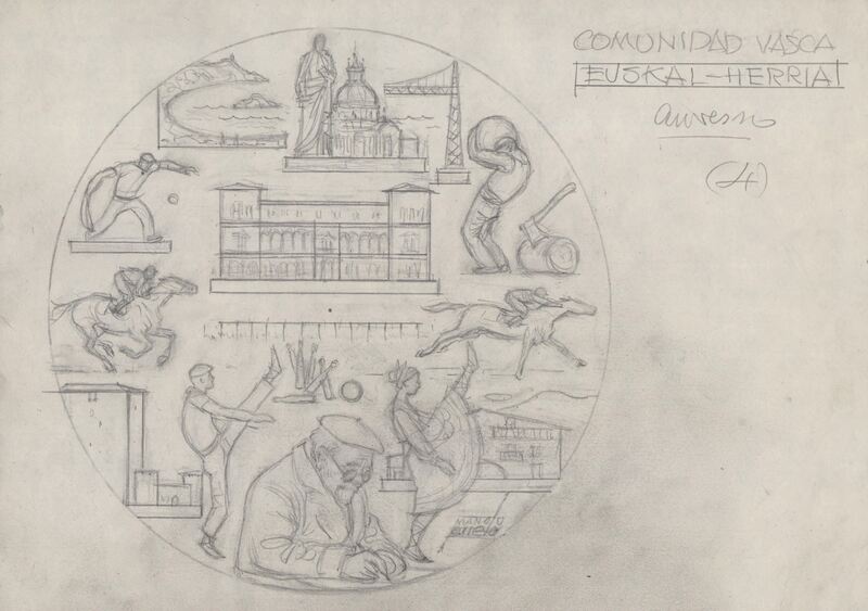 - Boceto a lápiz de la medalla conmemorativa de la Comunidad Vasca, donde en primer término se aprecia la figura de Pío Baroja rodeado de imágenes y elementos significativos de la región.